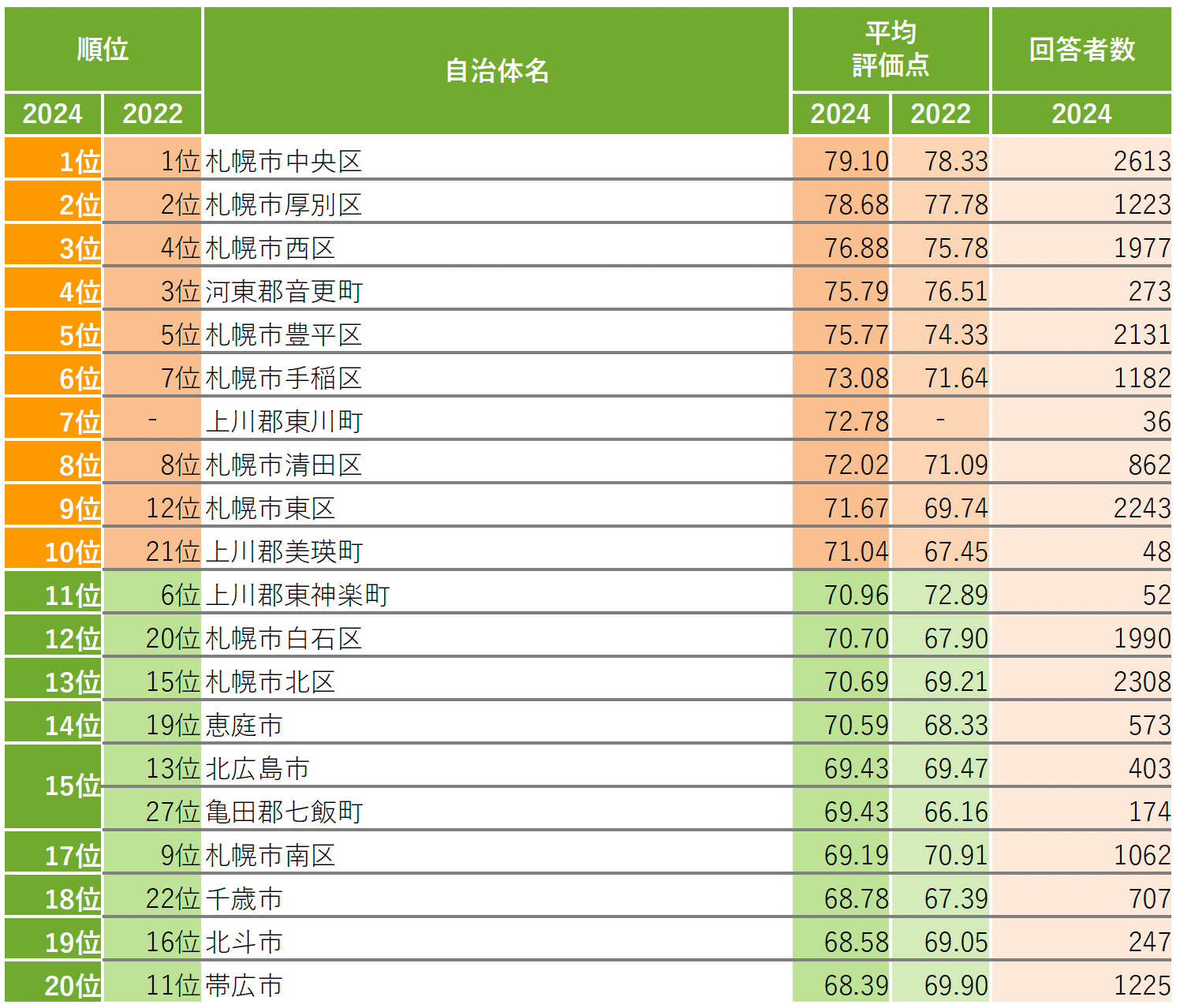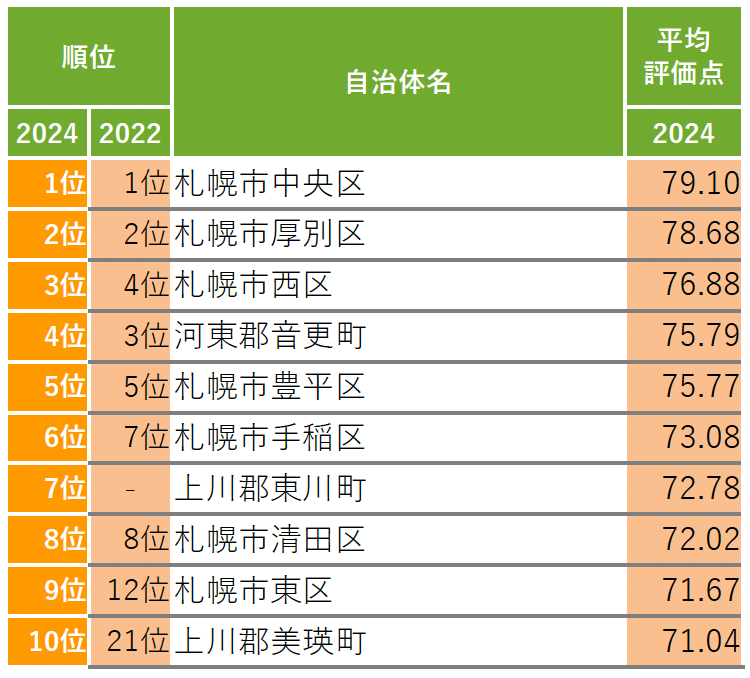 札幌市の10区はすべてトップ20にランクイン。トップ10には札幌市の7区のほか、「河東郡音更町」が4位、前回の調査では集計対象外だった「上川郡東川町」が7位にランクイン。「上川郡美瑛町」は前回の21位から10位に大きく上昇した。