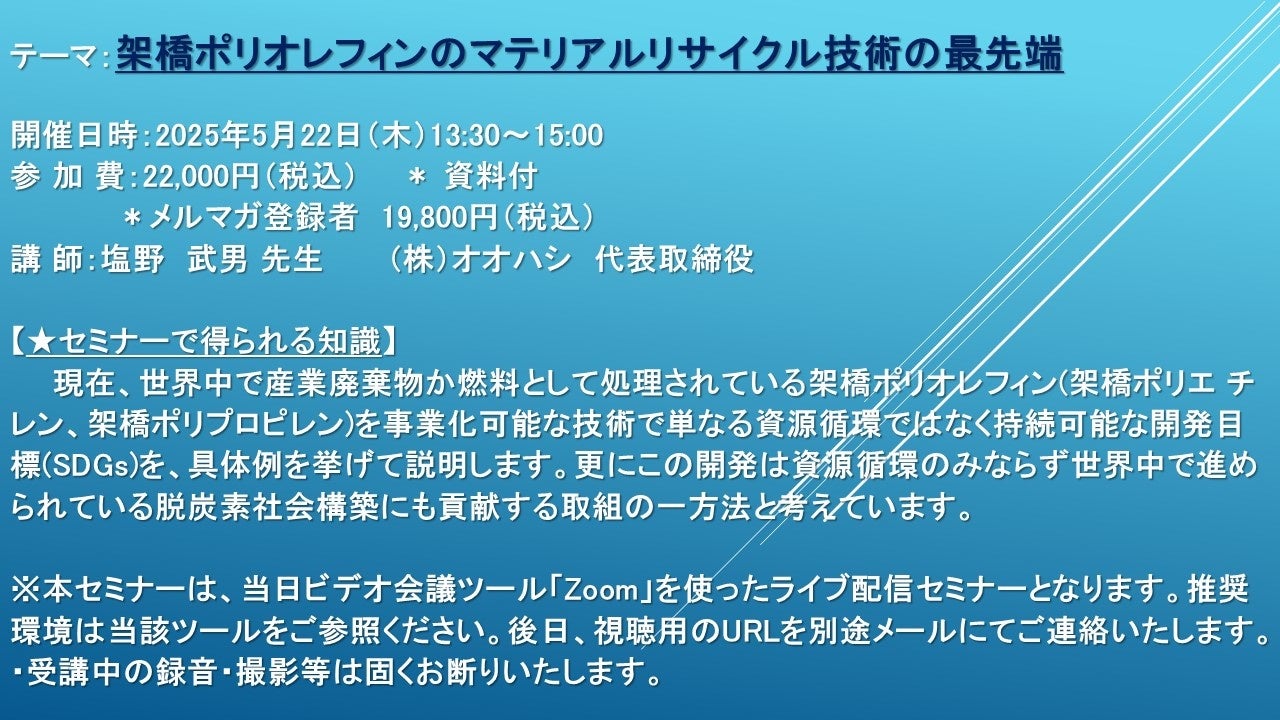 先端技術情報や市場情報を提供している(株)シーエムシー・リサーチ(千代田区神田錦町: https://cmcre.com/ )では、 各種材料・化学品などの市場動向・技術動向のセミナーや書籍発行を行っておりますが、 このたび「架橋ポリオレフィンのマテリアルリサイクル技術の最先端」と題するセミナーを、 講師に塩野 武男 氏 ((株)オオハシ 代表取締役)をお迎えし、2025年5月22日(木)13:30より、 ZOOMを利用したライブ配信で開催いたします。 受講料は、 一般:22,000円(税込)、 弊社メルマガ会員:19,800円(税込)となっております(資料付)。