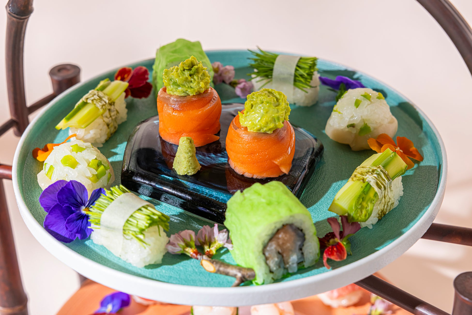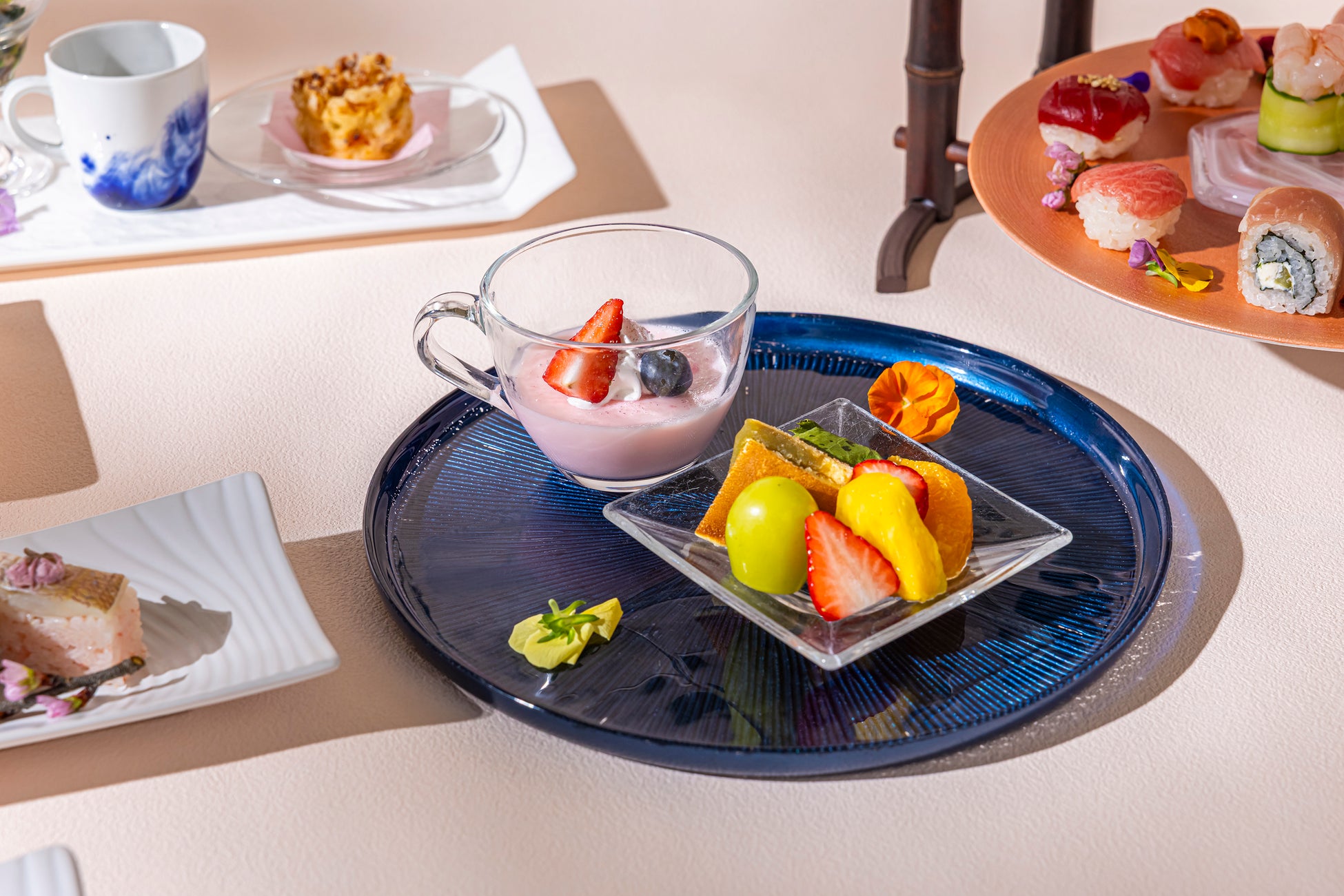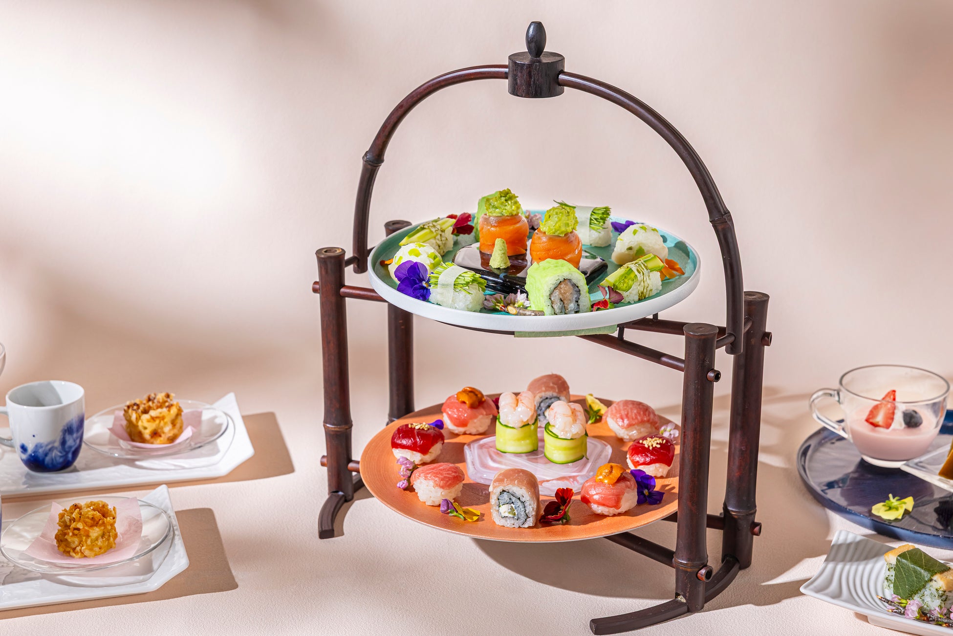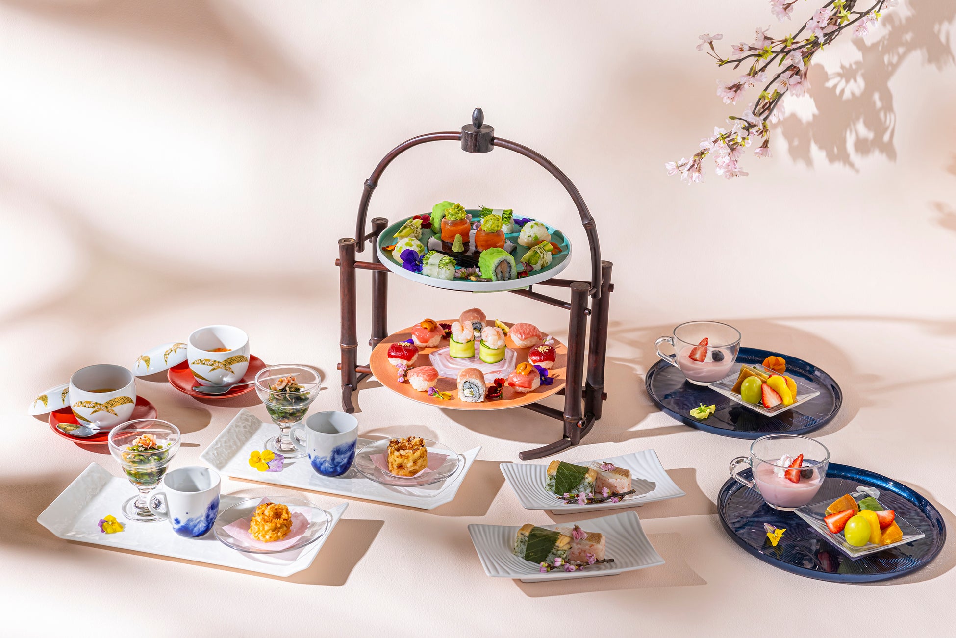 新しい出会いや新生活が始まる春の季節。この季節ならではの食材や色合いから春の巡りをお届けする和のアフタヌーンティーをご用意しました。寿司職人がアレンジする手毬寿司やロール寿司に加え、小鉢や蒸し物、季節のデザートプレートを桜色や緑をテーマカラーにした和のアフタヌーンティースタイルでご用意しました。