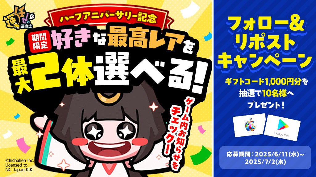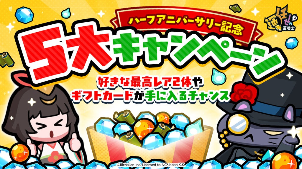 エヌ・シー・ジャパン株式会社(本社:東京都港区、代表取締役:林元基(イムウォンキ)、以下エヌシージャパン)は、カジュアルタワーディフェンスゲーム「運任せの召喚士」にて、2025年6月11日(水)より、ハーフアニバーサリーを記念した多数のイベントおよびキャンペーンの開始をお知らせします。