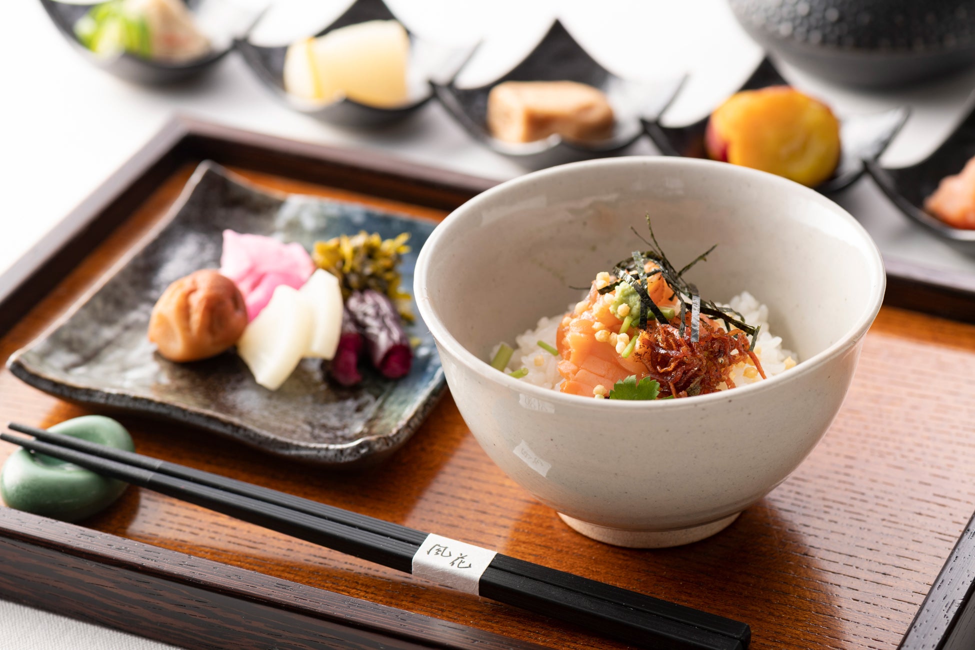 自分好みの具材を選ぶのが楽しいお茶漬けは、京都錦市場の「枡悟」のお漬物を贅沢にご用意。色とりどりの具材から、自分だけのオリジナルお茶漬けをお楽しみください。