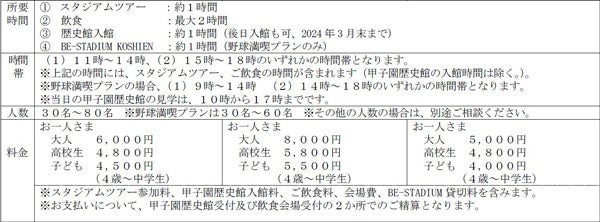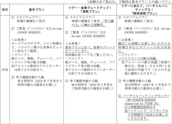 本プランは、スタジアムツアーと飲食で構成する「基本プラン」をはじめ、食事内容をグレードアップし、スタジアムツアーで「甲子園の土」に触れる体験が加わった「満喫プラン」、さらに阪神甲子園球場で野球をしているかのような体験ができるバーチャルバッティングセンター“BE-STADIUM KOSHIEN supported by STAND IN”の貸切利用が付いた「野球満喫プラン」があります。