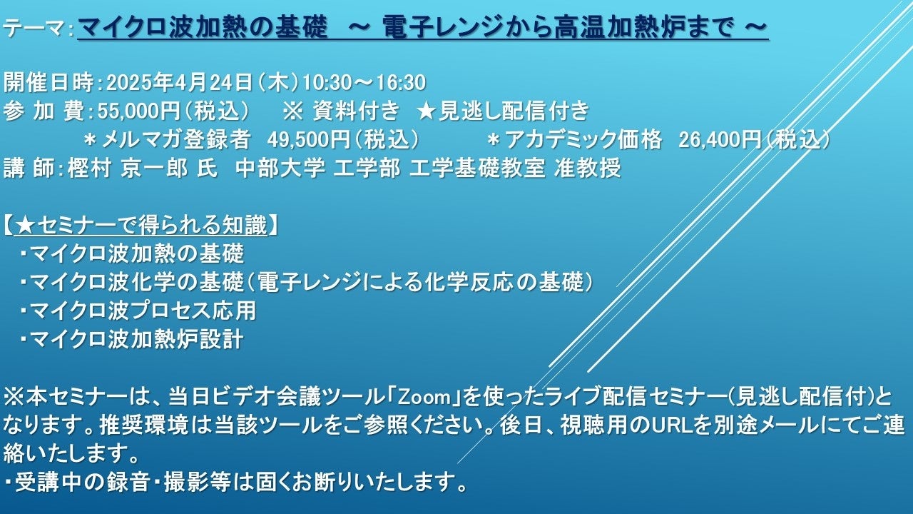 【ライブ配信セミナー】マイクロ波加熱の基礎 ~ 電子レンジから高温加熱炉まで ~ 4月24日(木)開催 主催:(株)シーエムシー・リサーチ