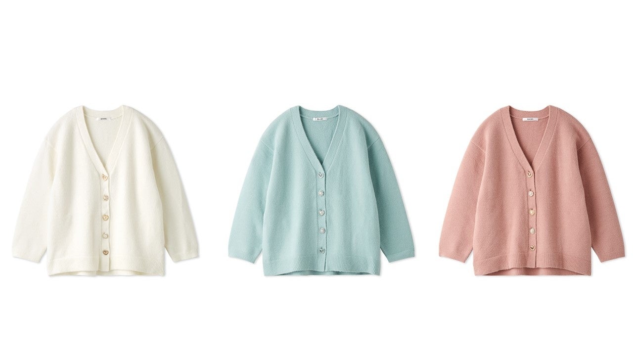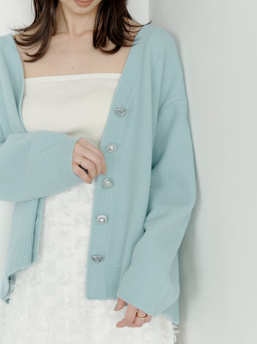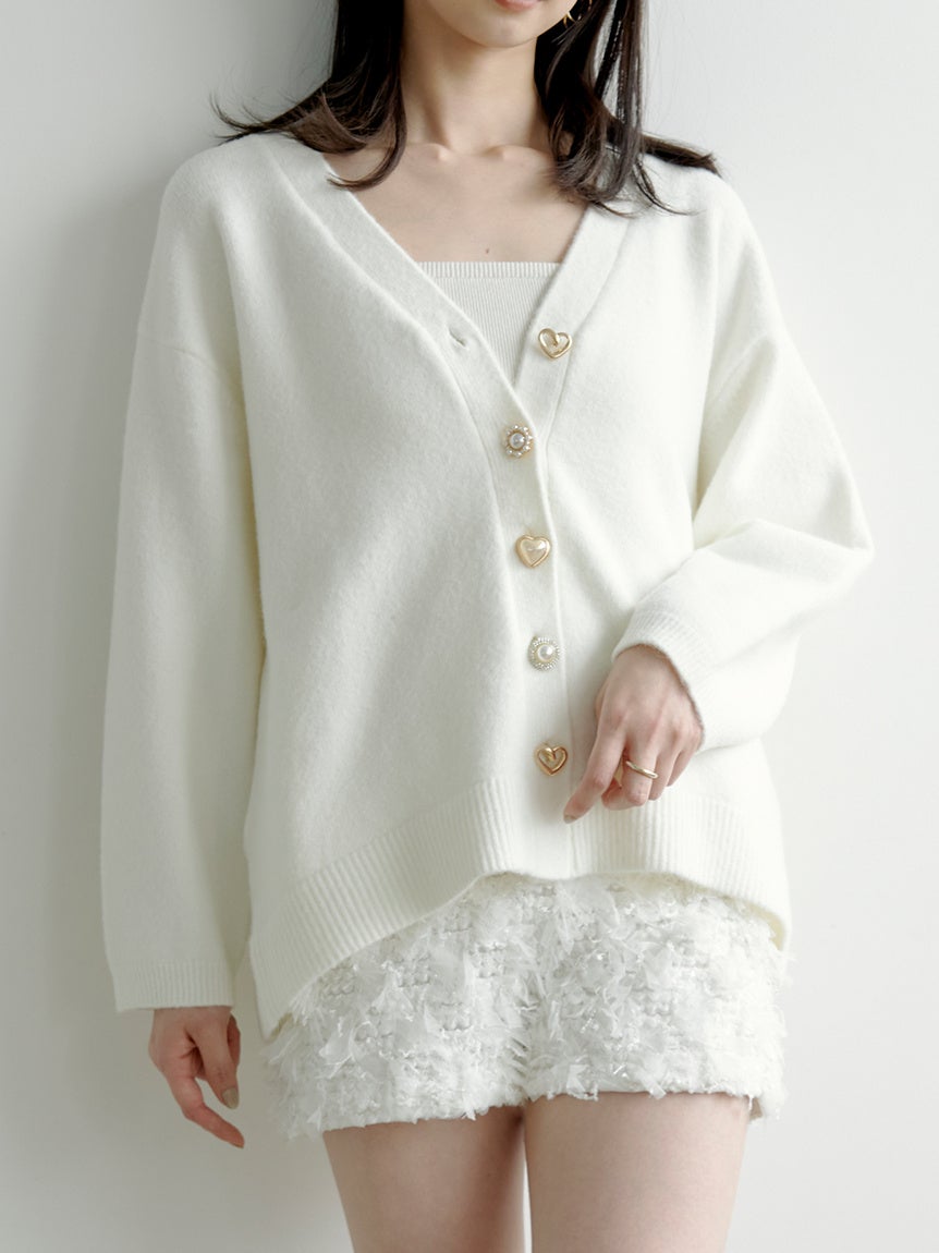 オリジナルのハートモチーフやパール、ビジューボタンがきらめく、カーディガン。