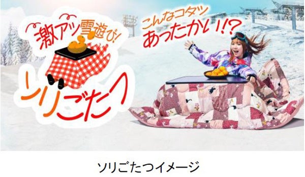 雪ゾリ・雪あそびゲレンデ「スノーランド」では『ずっとこたつに入っていたいけど雪あそびもしたい』という人のワガママな夢を叶えるソリが誕生。その名の通り「こたつ」の形をしたこのソリでは、こたつ布団に体を入れたまま雪の上を走行することができます。
