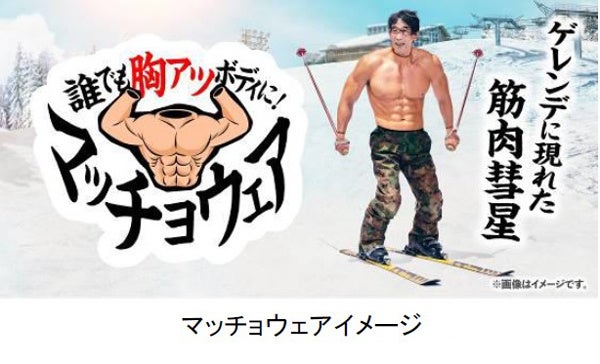 物理的にも精神的にも「胸をアツくする」ために独自開発した、着れば誰でもマッチョになれる筋肉型のウェアが登場。着用してゲレンデを滑走する姿は季節感を忘れるほどアツい光景が広がります。