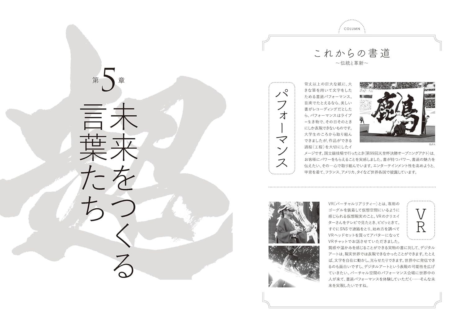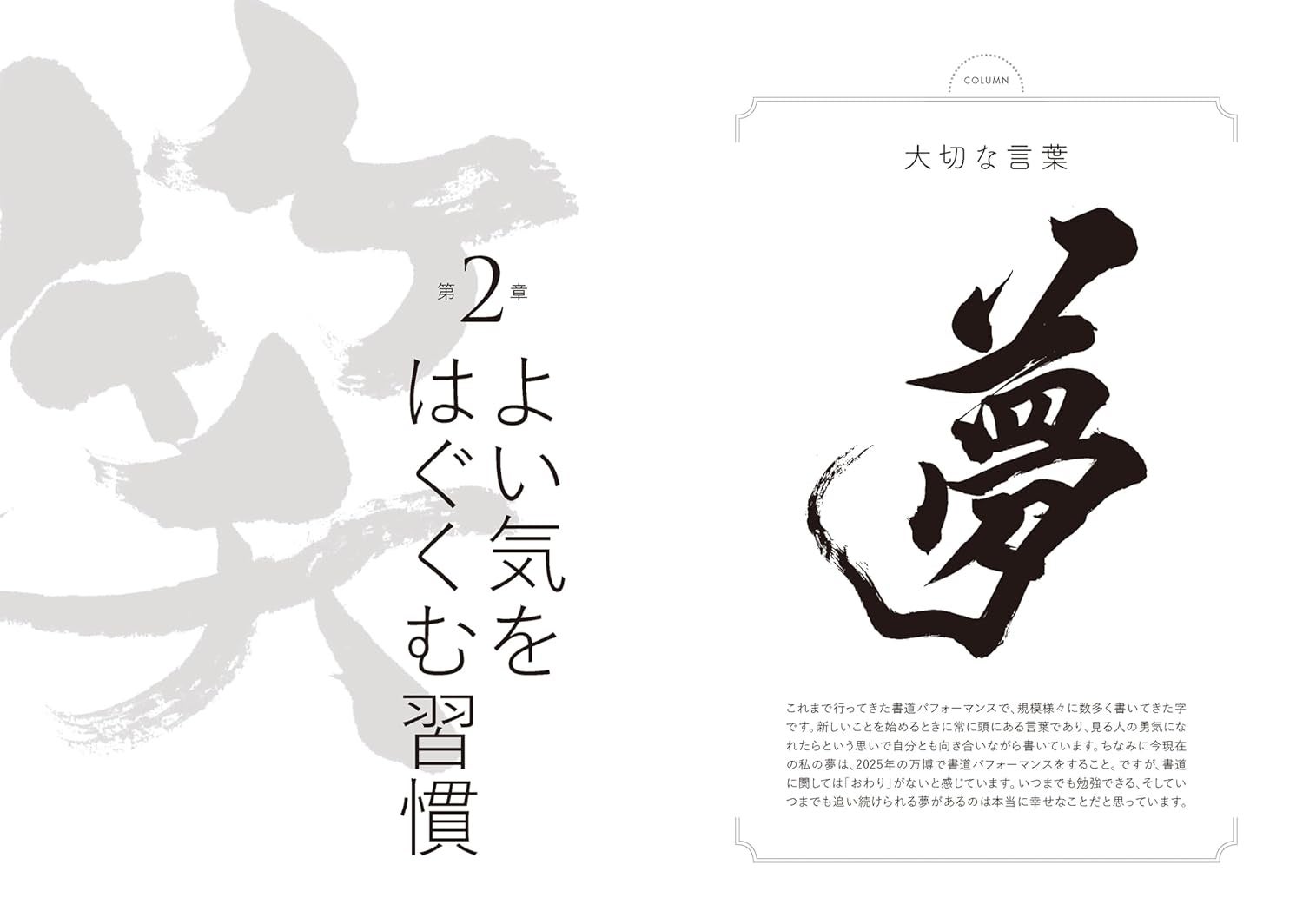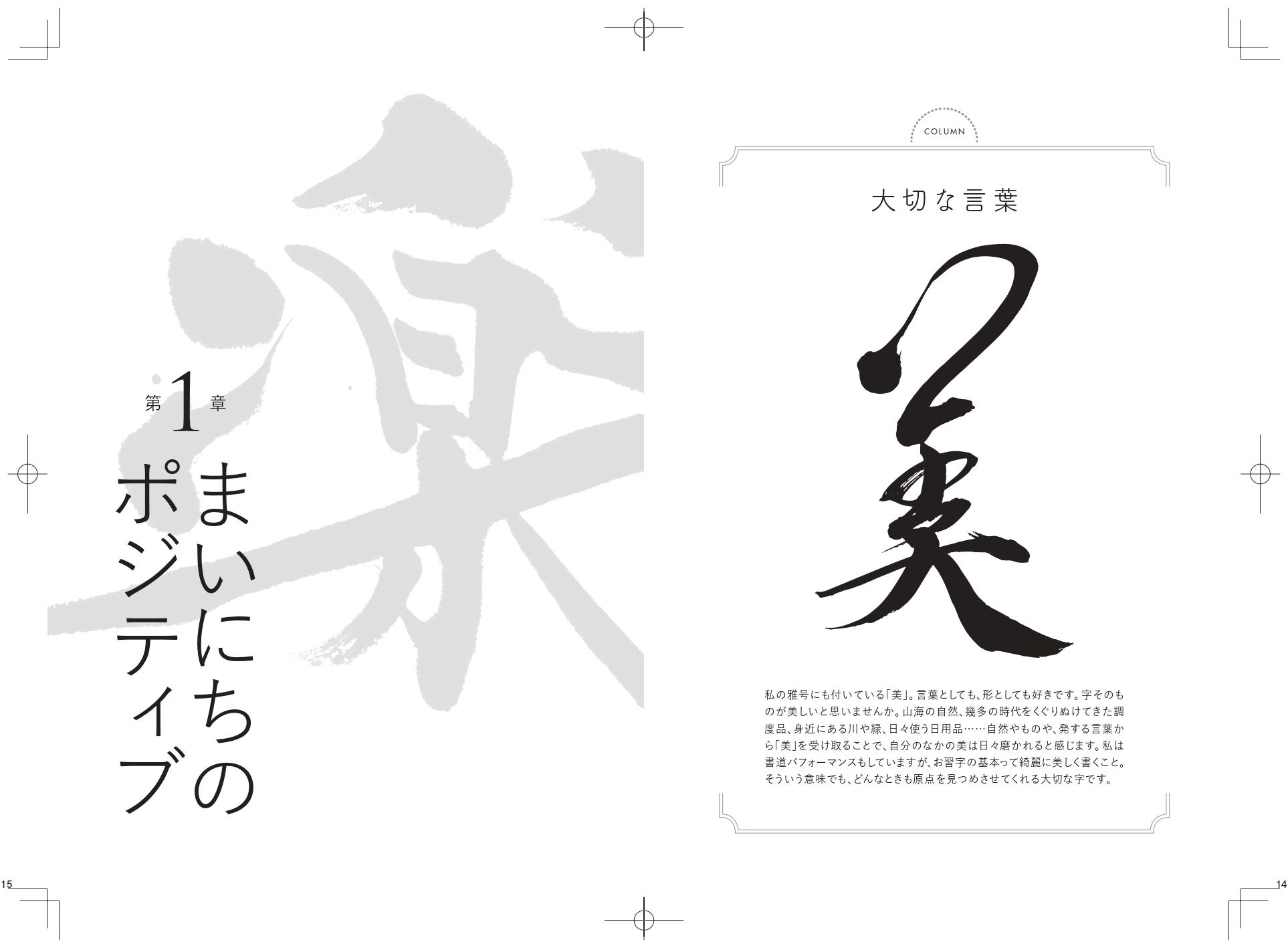 ちょ っと悩んだとき、楽しくハッピーに、明るくなれるヒントが詰まった一冊です。 学生時代は結構ヤンチャ(関西弁でいう“ゴンタ”)で母親が呼び出されるこ ともしばしば……。サーフィン好きで金髪ギャルだった時期もあったものの、ど んなときにも書道は続け、世界で認められる書道パフォーマンスを披露し、 MBS「情熱大陸」で取り上げられたことも。今もEテレ「にほんごであそぼ」でも 活躍されています。