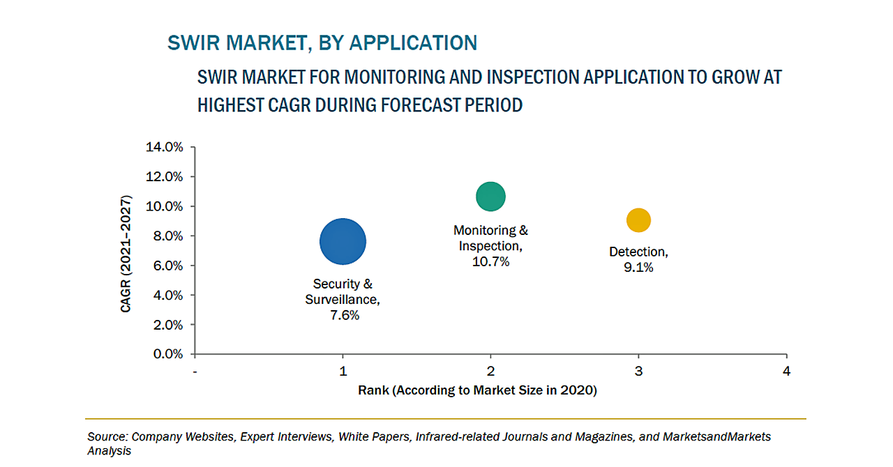 SWIRカメラは、霧、煙、霞、水蒸気などの過酷な環境下でも見通すことができるため、海洋情報、監視、視覚の強化など多くの用途で使用されており、軍事・防衛分野でのSWIRカメラの普及が進んでいます。また、長波長赤外線(LWIR)や中波長赤外線(MWIR)カメラとは異なり、昼夜を問わず車両のフロントガラスを見通すことができることや、爆発物と非爆発物を識別することができることから、SWIRカメラの特殊作戦車両への応用も広がっています。さらに、低照度や暗視画像、人間の目に安全な照明、遠くからターゲットをカバーして認識する能力、そして照明源がない場合でも画像を見ることができる隠密照明の機能により、軍事・防衛分野でのSWIRカメラの採用が増加しています。