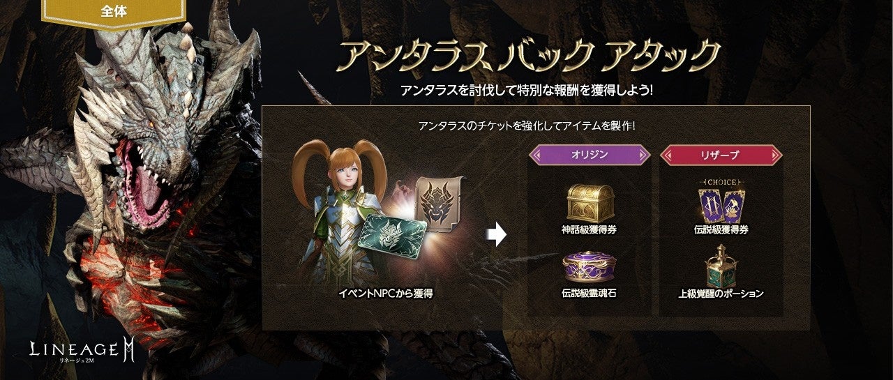 『リネージュ2M』本日6月13日20時20分から「アンタラス バック アタック」を開催!それぞれのワールドのプレイヤーと共に強大なボス モンスター「アンタラス」を討伐しよう!
