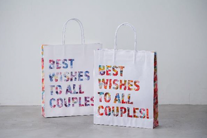 これまで書店などで『ゼクシィ』を購入した方には特別なピンクのトートに入れてお渡ししていましたが、今回ヘラルボニー契約作家のアートを採用し、デザインを一新しました(2024年8月ごろより一部書店で配布開始)。「BEST WISHES TO ALL COUPLES!」と全てのカップルを応援するメッセージが込められています。