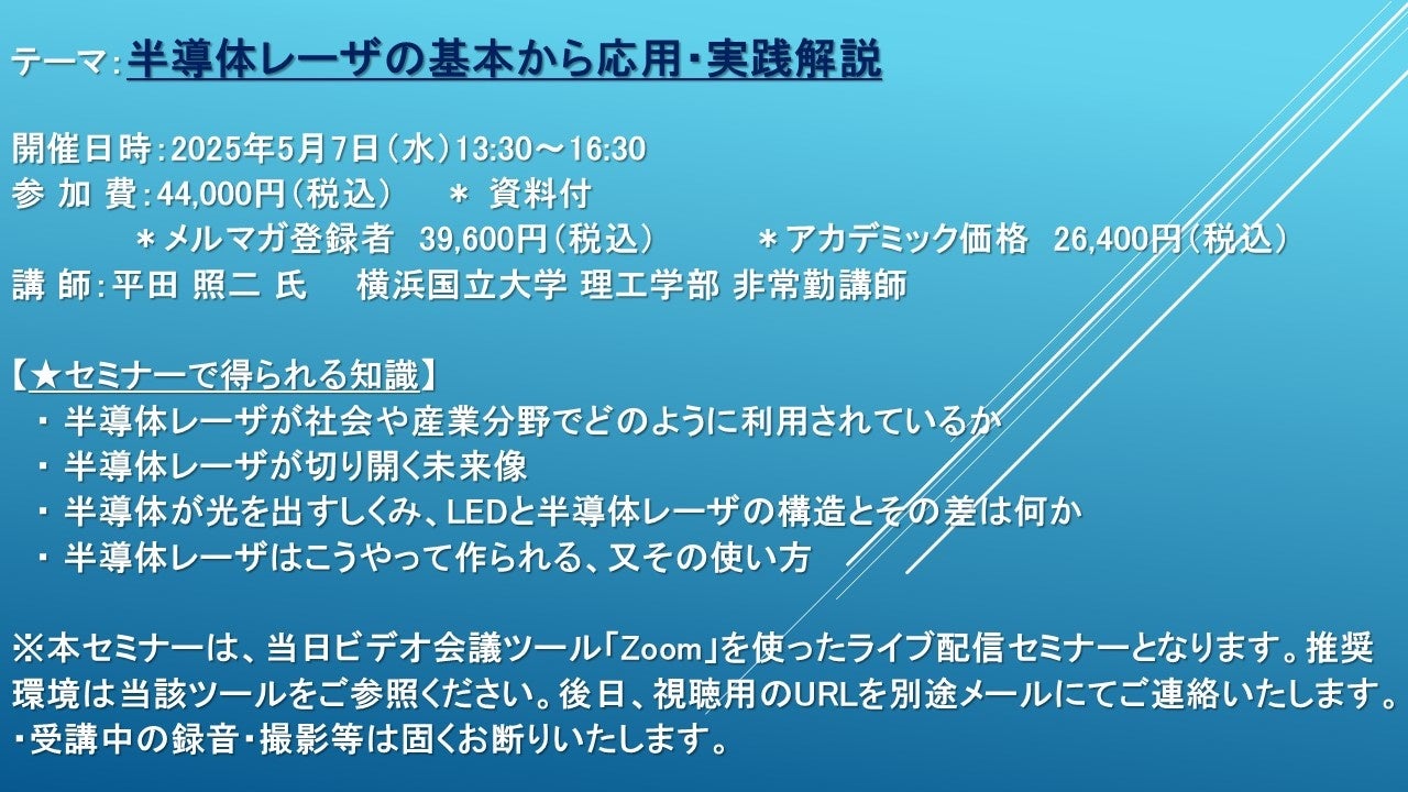 先端技術情報や市場情報を提供している(株)シーエムシー・リサーチ(千代田区神田錦町: https://cmcre.com/ )では、 各種材料・化学品などの市場動向・技術動向のセミナーや書籍発行を行っておりますが、 このたび「半導体レーザの基本から応用・実践解説」と題するセミナーを、 講師に平田 照二 氏 (横浜国立大学 理工学部 非常勤講師)をお迎えし、2025年5月7日(水)13:30より、 ZOOMを利用したライブ配信で開催いたします。 受講料は、 一般:44,000円(税込)、 弊社メルマガ会員:39,600円(税込)、 アカデミック価格は26,400円(税込)となっております(資料付)。