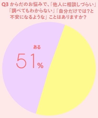 gokigen Lab.が行ったインターネット調査では、フェムテックを知らないと答えた人が77%、からだやこころのお悩みについて情報を必要としている人は69%。からだの悩みで「他人に相談しづらい」「調べてもわからない」「自分だけでは?と不安になるようなことがある」と答えた人は51%と、からだの・こころ・性のことなど、悩みごとを自分一人では解決しにくい実態が浮かび上がります。