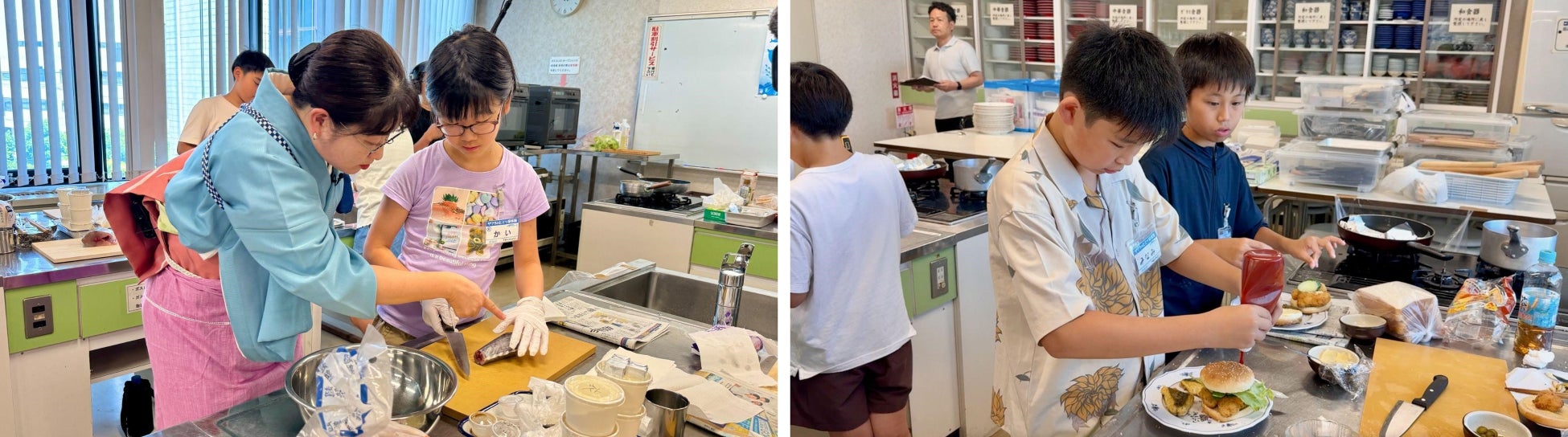3日目は金沢に戻ってのプログラム。石川で食習慣の無いサワラ消費を目指したファストフードメニューの開発です。まずはぶつ切りにしたサワラの三枚おろしに挑戦しました。講師はフードコーディネーターの佐冨上あつ緒さん。子どもたちは悪戦苦闘しながら自分たちでさばいたサワラ(サゴシ)を、フライとムニエルに調理した後、野菜や調味料をアレンジしてそれぞれのハンバーガーとサンドイッチを作りました。