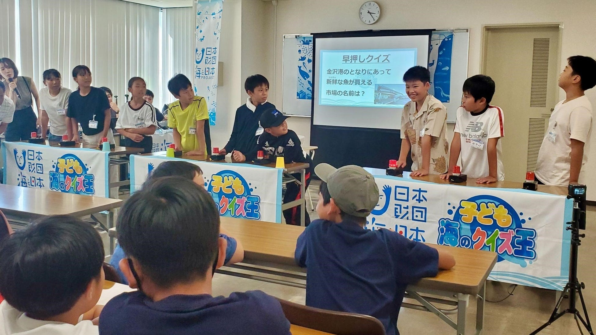 最後のプログラムは、3日間の海の学びを本格的な早押しボタンで振り返る「こども海のクイズ王」です。「鰆」の書き方や講師の名前など様々な問題を次々に出題。子どもたちは初めての早押しボタンに、ドキドキワクワクしなが楽しく解答し、クイズ王は盛り上がりました!