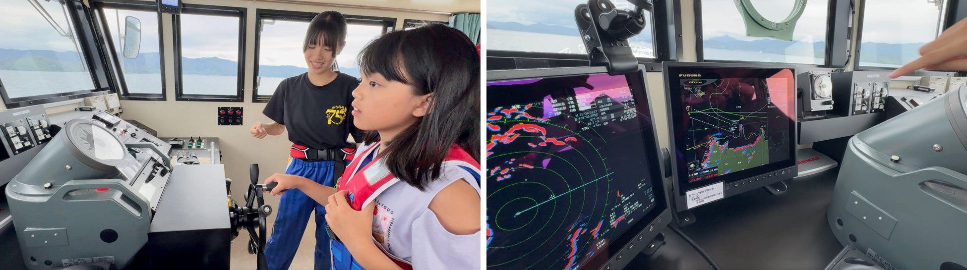 小浜港への帰路、子どもたちは順番に実習船・雲龍丸の操舵を体験。荒波に怯えていた子どももいましたが、高校生や先生たちの「海を好きになって帰って欲しい!」という温かい気持ちに励まされて、全員が全てのプログラムを体験することができました。