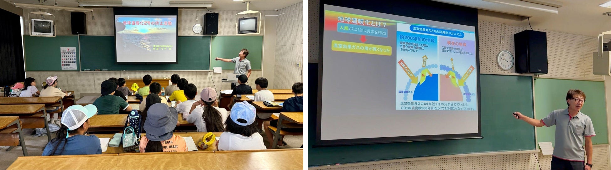雲龍丸を降りた子どもたちは若狭高校の海洋キャンパスへ。毛利誠教諭が地球温暖化が福井の海洋環境と漁業に与える影響についてレクチャーします。