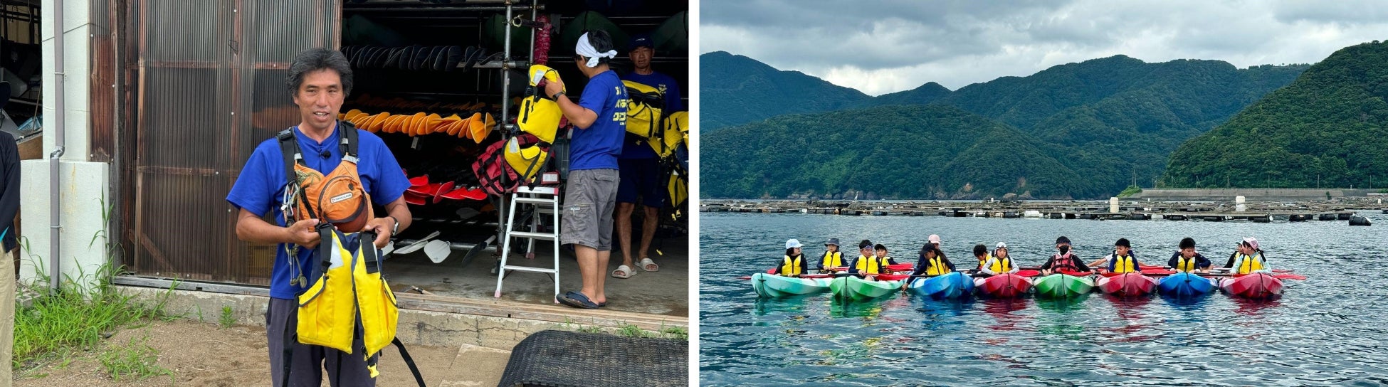 今回の宿泊地である小浜市阿納は、波穏やかな内湾。2日目最初のプログラムは、この海でのシーカヤック体験です。インストラクターは阿納パドラーズクラブの河原正和さん。まずは海での安全な活動に必要な「海のそなえ」として、ライフジャケットの重要性と装着方法を教えます。パドルの使い方とシーカヤックの扱い方を学んだら、いざ海へ!初めてとは思えないほど、子どもたちはスムーズに海を進みました。
