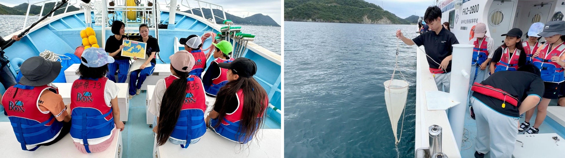 子どもたちにいろんなことを教えてくれたのは若狭高校海洋科学科の高校生。風が強く荒れ気味の海でしたが、風裏の波が小さな海域に移動して停泊。子どもたちは3班に分かれて、海中プランクトン観察や水中ドローン操作を体験し、若狭湾の海に関する高校生のレクチャーも受けました。