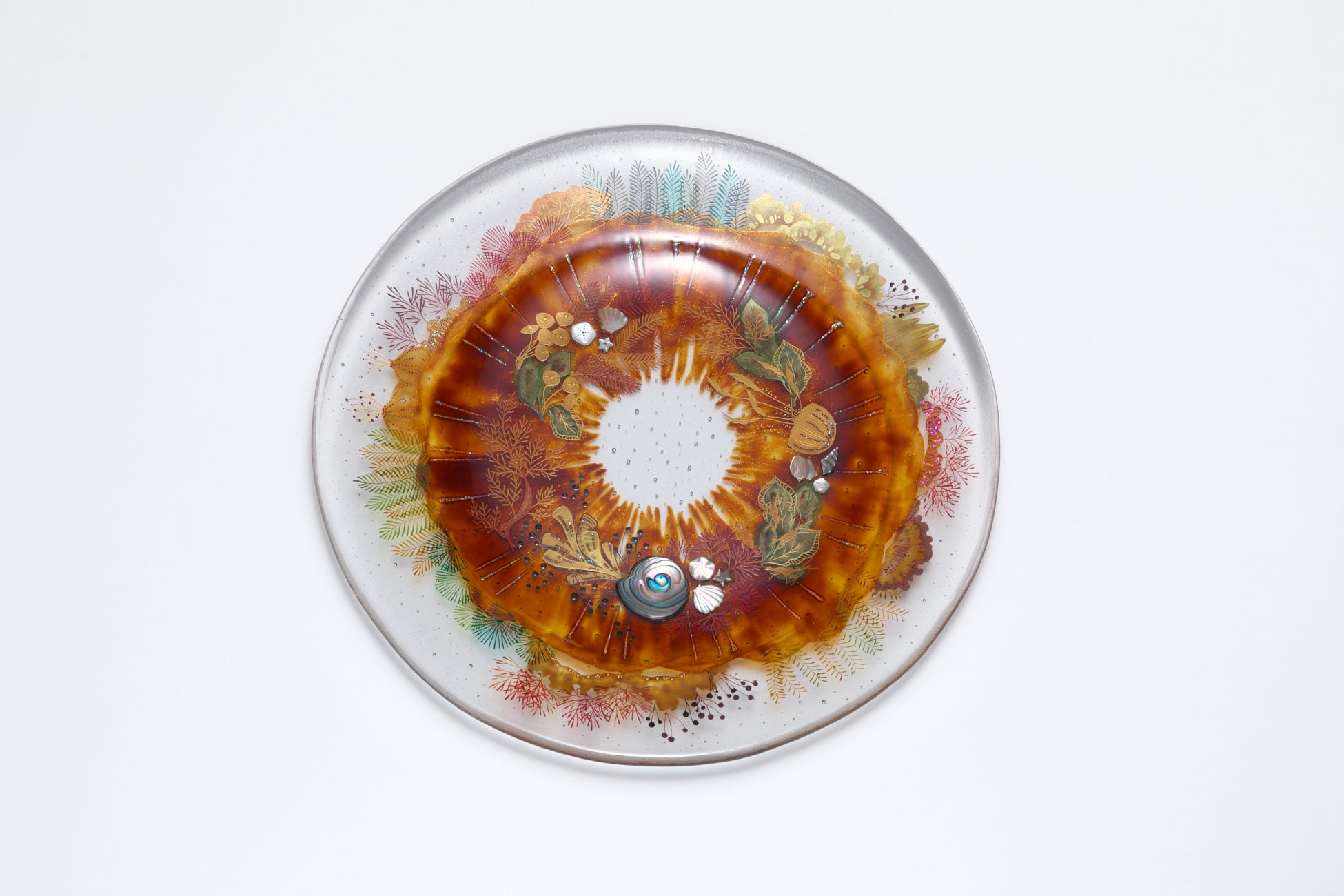 藤田 和 氏は、金沢の豊かな自然に囲まれながら制作活動を行っています。漆とガラス、金銀や鮑などの貝殻を組み合わせることで、これまでにない華やかで重層的な表現の作品を目指しています。草花を描いた軽やかな線がガラスを彩る食器や、水中を覗き込むような作品をお楽しみください。