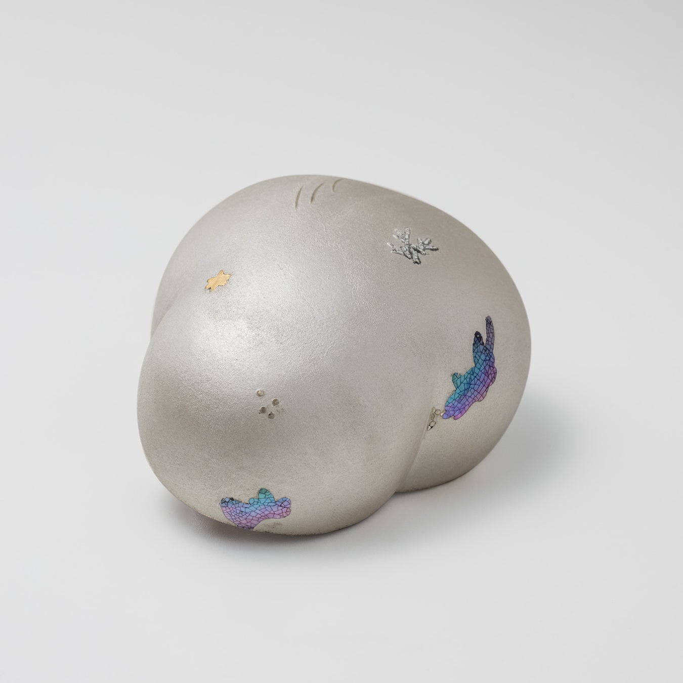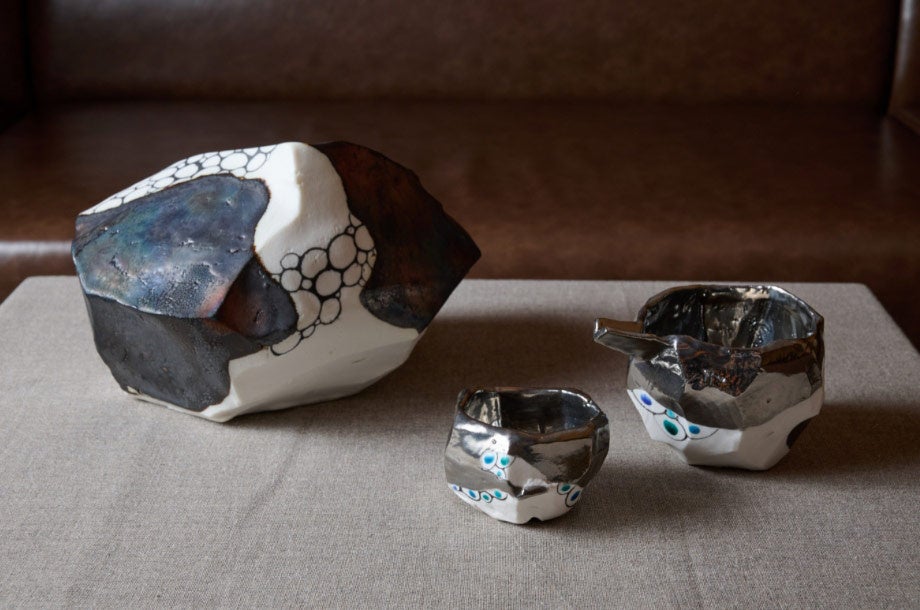 今⻄ 泰赳 氏は、「細胞の増殖」と「生命エネルギー」をテーマに、独自に調合した土と釉薬、また九谷焼の技法などをハイブリッドに使用して自己表現作品を制作しています。見る角度、光によっても表情を変える作品は、いつも新しい発見を与えてくれます。