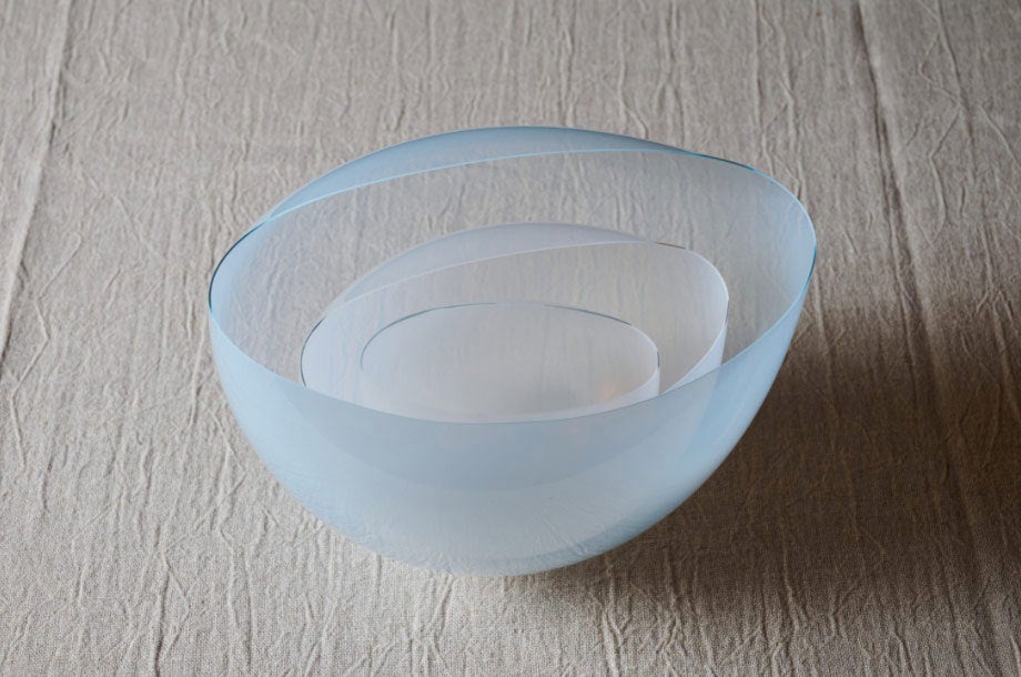 田中 里姫 氏は、熱と重力の自然な力によって、やわらかな形状に変化したガラスの作品を制作しています。薄いガラスの研ぎ澄まされた緊張感と、光を透過し反射する様子は、他者の心象を呼び起こし、その知覚を強調します。