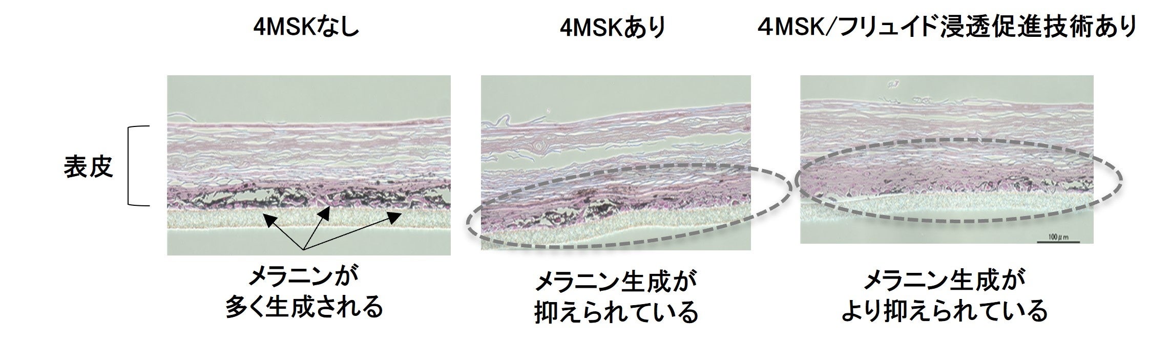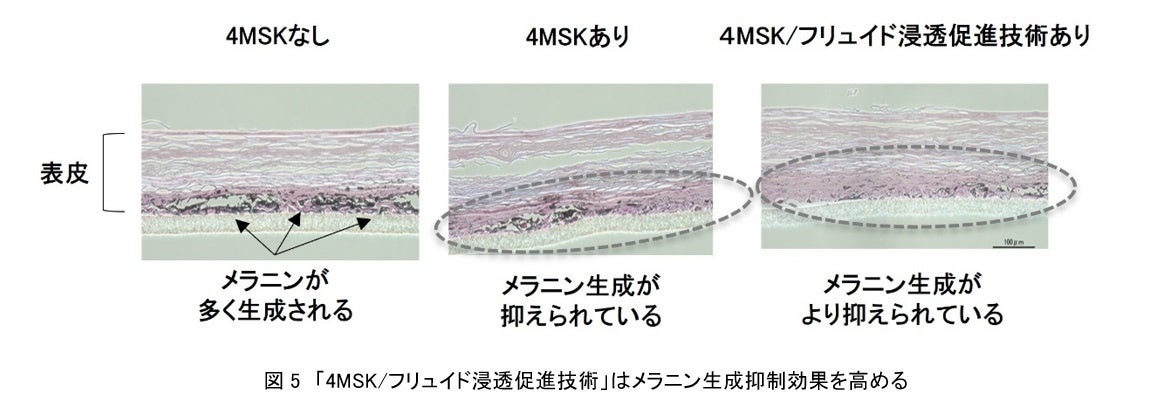 「4MSK/フリュイド浸透促進技術」の効果を3次元培養皮ふモデルで検証した結果、4MSKのメラニン生成抑制効果を高める効果があることが分かりました(図5)。また4MSKにはメラニンが蓄積した角層の剥離を促進する効果がありますが、この技術を用いることで、その効果を高める可能性があることも示唆されました。
