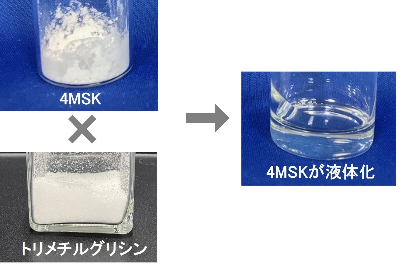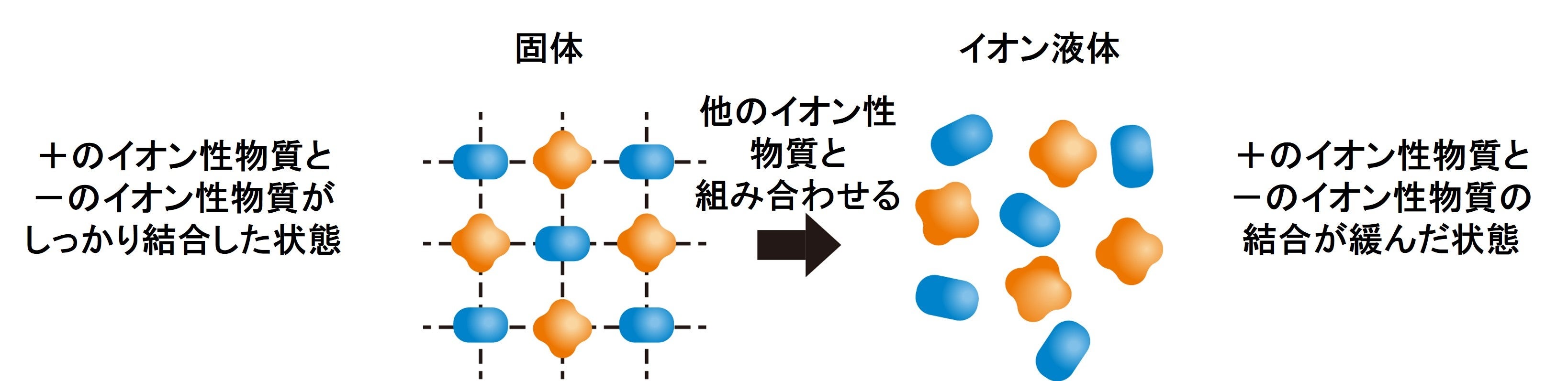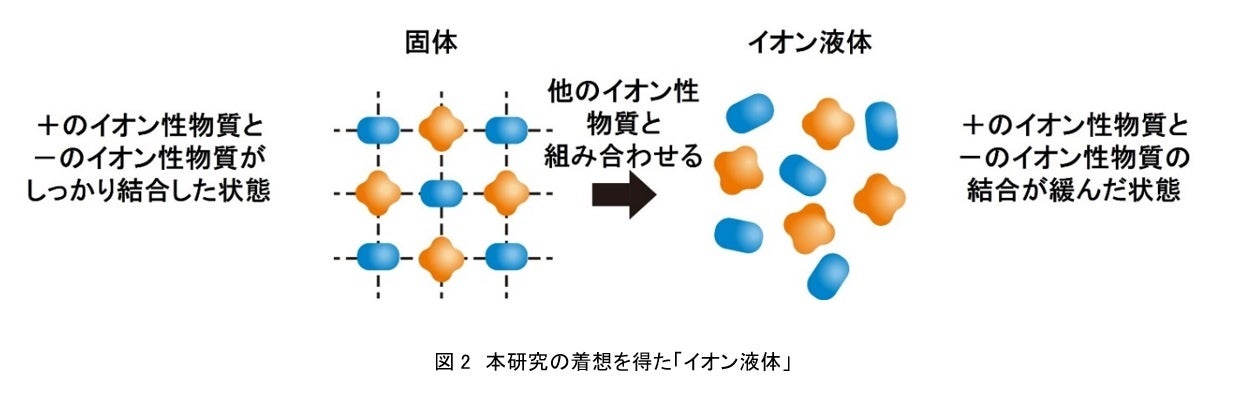 この課題に取り組むべく、近年化学の分野で注目される「イオン液体」に着目しました。イオン液体は融点(固体が融解し液体になるときの温度)の高いイオン性の物質同士を組み合わせることで、元の物質の融点より低い温度で液体になる新しいタイプの液体です(図2)。私たちは、常温で固体の4MSKを他の物質と組み合わせイオン液体化ができれば、肌上でも液体の性質を持続させることが可能になると考えました。そこで、4MSKと組み合わせることで液体化する物質の探索を進めることにしました。