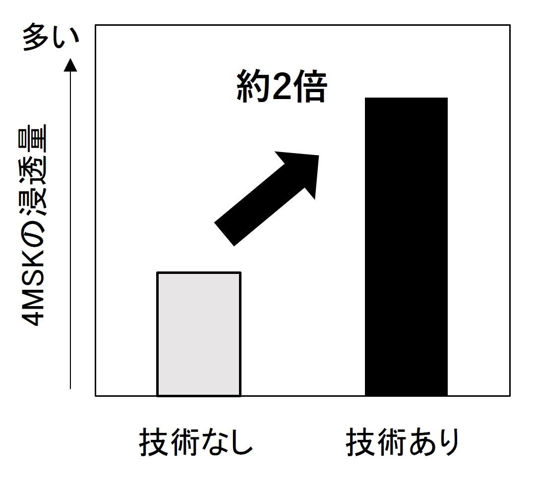 4MSKと組み合わせる物質やその組成の検証を100通り以上で行いました。その結果、保湿成分トリメチルグリシンを最適な配合比率で組み合わせることで4MSKが液体化することを見出しました(図3)。この配合比率で2つの成分を基剤に配合すると、4MSK単独で基剤に配合する場合と比べ、4MSKが皮ふへ約2倍浸透することを確認しました(図4)。基剤中の4MSKが液体状態を保った結果だと言えます。私たちは4MSKの皮ふ浸透性を高めるこの技術を「4MSK/フリュイド浸透促進技術」と名付けました。