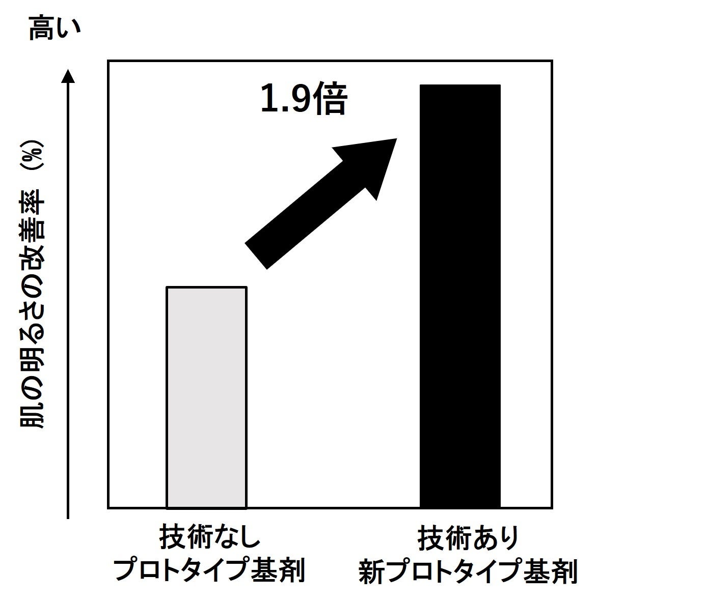 「4MSK/フリュイド浸透促進技術」を搭載した新プロトタイプ基剤では、従来どおり4MSKを配合したプロトタイプ基剤と比較し、シミの数が12週で1.8倍減少しました(図6)。肌の明るさも12週で1.9倍改善しました(図7)。