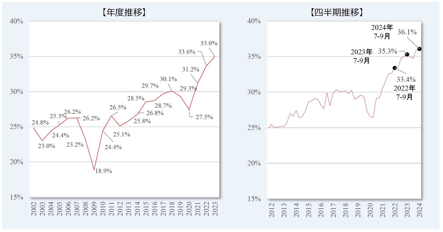 新型コロナウイルスの感染が拡大し始めた2020年1-3月期を起点に大きく水準を切り下げたが、翌年2021年1-3月期には概ね感染拡大前の水準に復した。以降、最高値※1を更新しながら上昇を続けており、足元2024年7-9月期は過去最高値となっている。