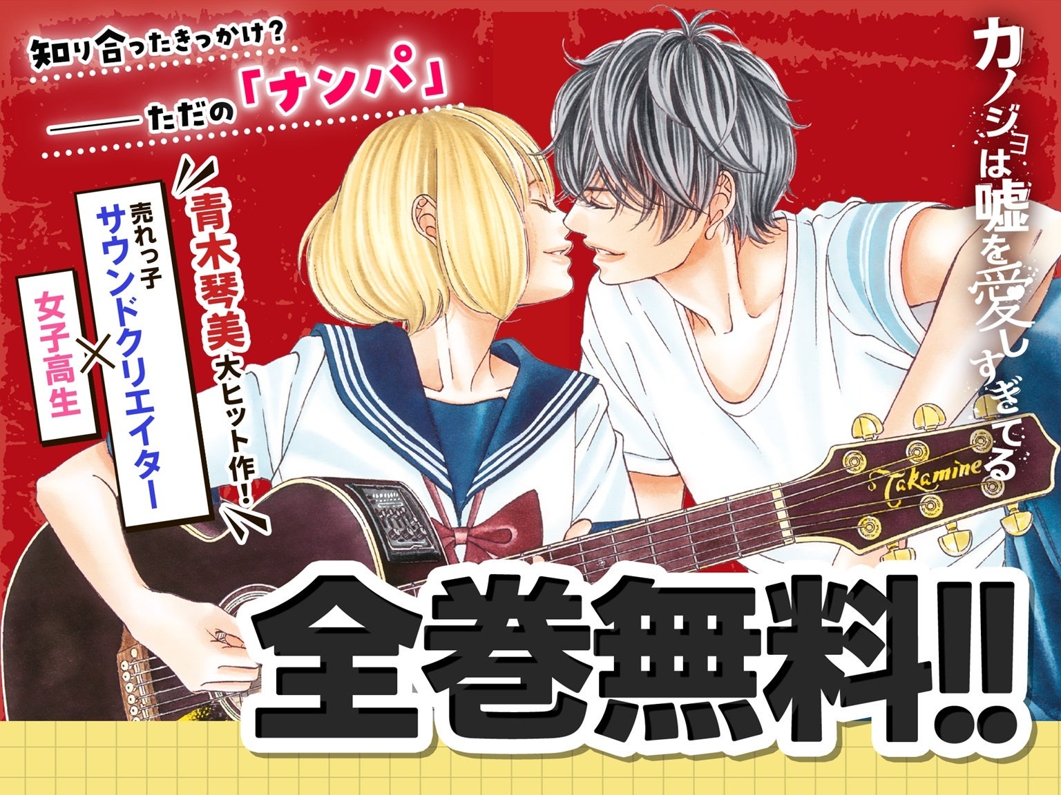 青木琴美による累計670万部突破の大ヒット漫画『カノジョは噓を愛しすぎてる』が24時間限定で全話無料公開される特別企画が、2024年8月24日(土)0時より、小学館の少女マンガサイト「フラコミlike!」にて実施されます。