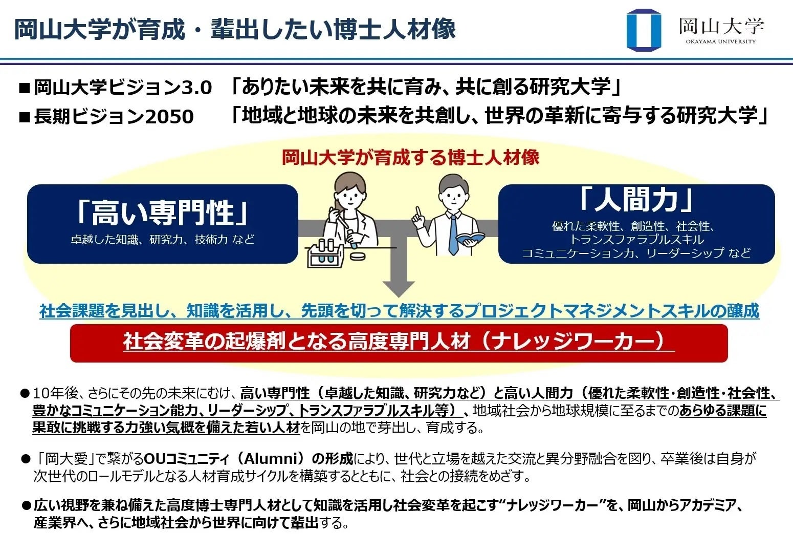 ・【岡山大学】岡山大学「大学院修学支援制度」を始動 ~大学職員の高度化のひとつの手段としてナレッジワーカーとしての博士人材を育成・活用し、かつ大学法人経営や大学院改革の強化へ~