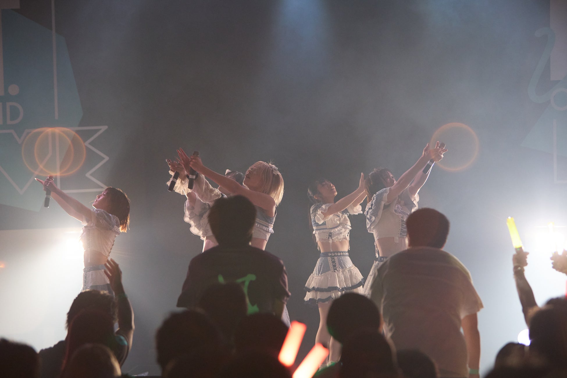 4番手は、6月にTOKYO DOME CITY HALLでのワンマンライブを成功させたMyDearDarlin’。7月末より新メンバー・濱田菜々を加えた新たな体制で、夏フェスなど連日止まらず走り続けてきたメンバーたち。 夏の終わりを迎えようとしているこの日は、ライブで人気曲の「ナノLOVE」からスタート。会場全体、踊れる曲でフロアの気持ちが一丸になっていくと、「告白」、「MDDシンドローム」といったクールなサウンドとキレのあるメンバーのダンスで会場を興奮の渦に包み込んでいく。激しい曲を中心にノンストップで飛ばしていく中、最後はエモーショナルな楽曲「君の声」で場内の空気感を一変させる。全員が拳を上げて声を出すこの曲ならではのパートはとても印象的。パフォーマンスの幅広さが特徴の、マイディアのライブを全面に押し出した30分のショータイムとなった。