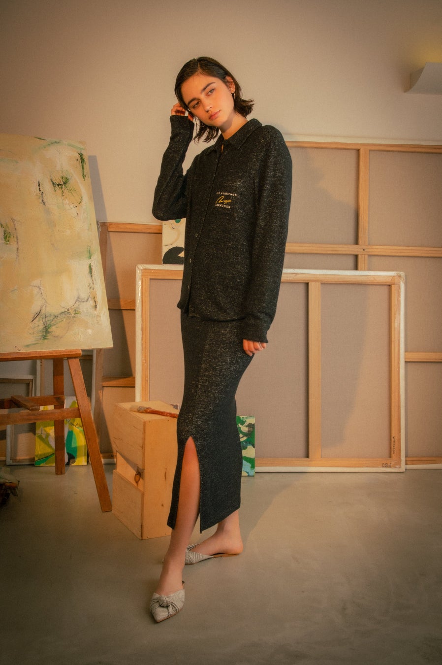 ラウンドさせた裾のラインやストンと落ちるようなサイズ感にこだわった、モードな印象の開襟シャツ。スリットデザインが上品なロングスカートは伸縮性に優れ、ストレスフリーな着心地でリラックスタイムにぴったりです。