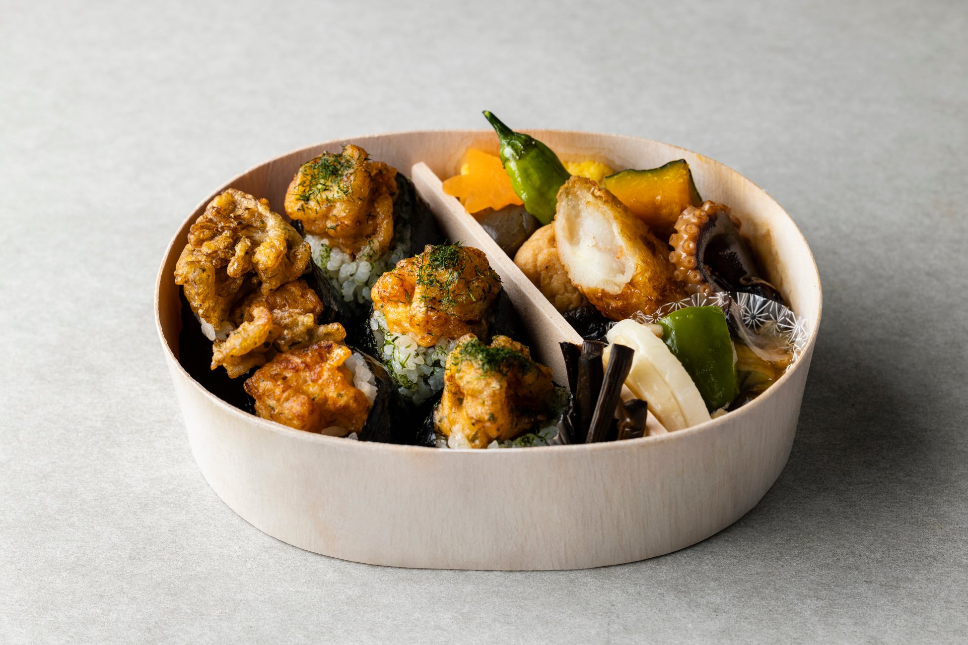 すじ青のりを衣とご飯にたっぷり混ぜこんだ特製の海老天むすと、季節限定の舞茸天むすの贅沢なお弁当です。