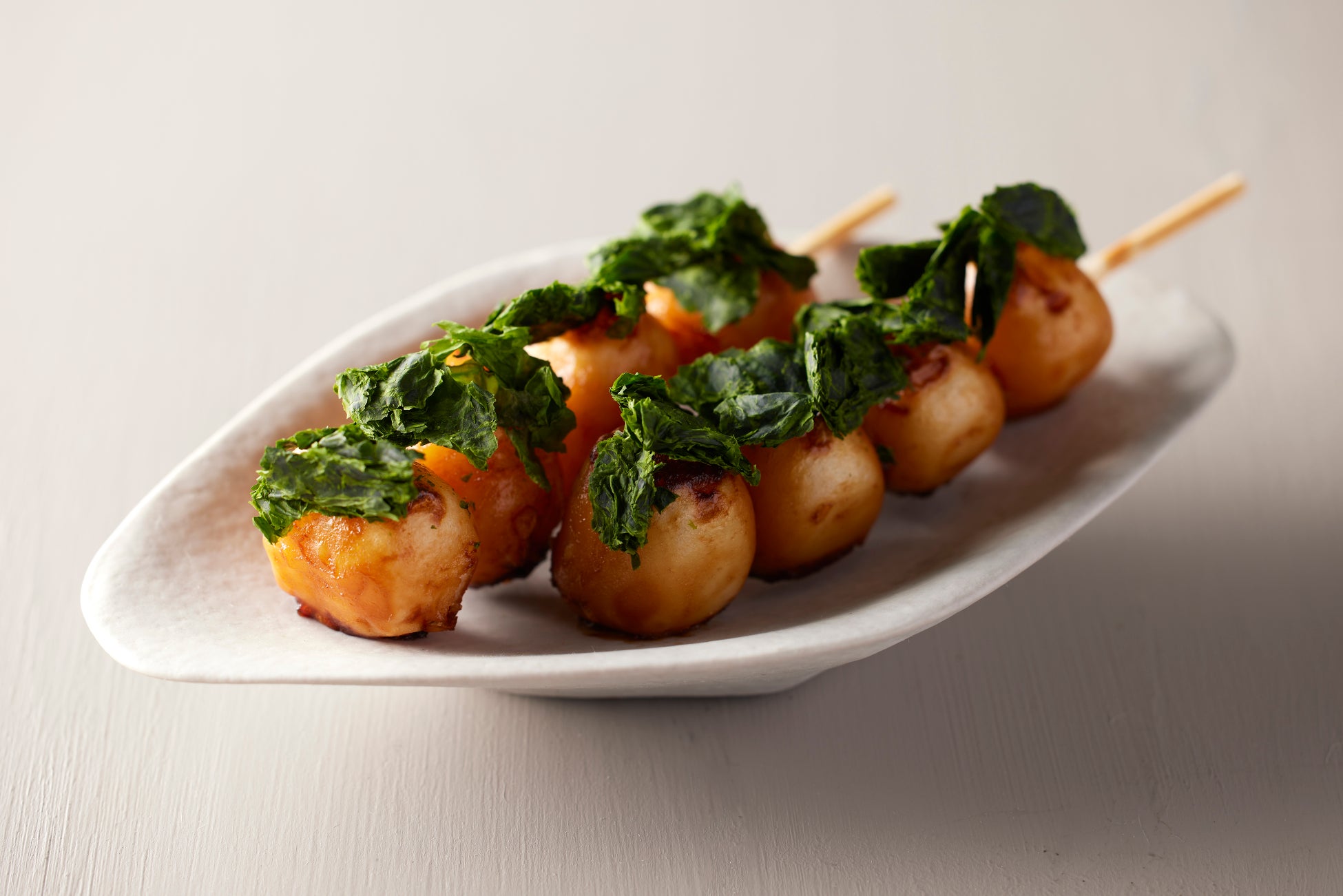 たまり醤油をからめた団子。ほろ苦いあつばアオサがアクセントとなり、味わいに奥行きを与えています。
