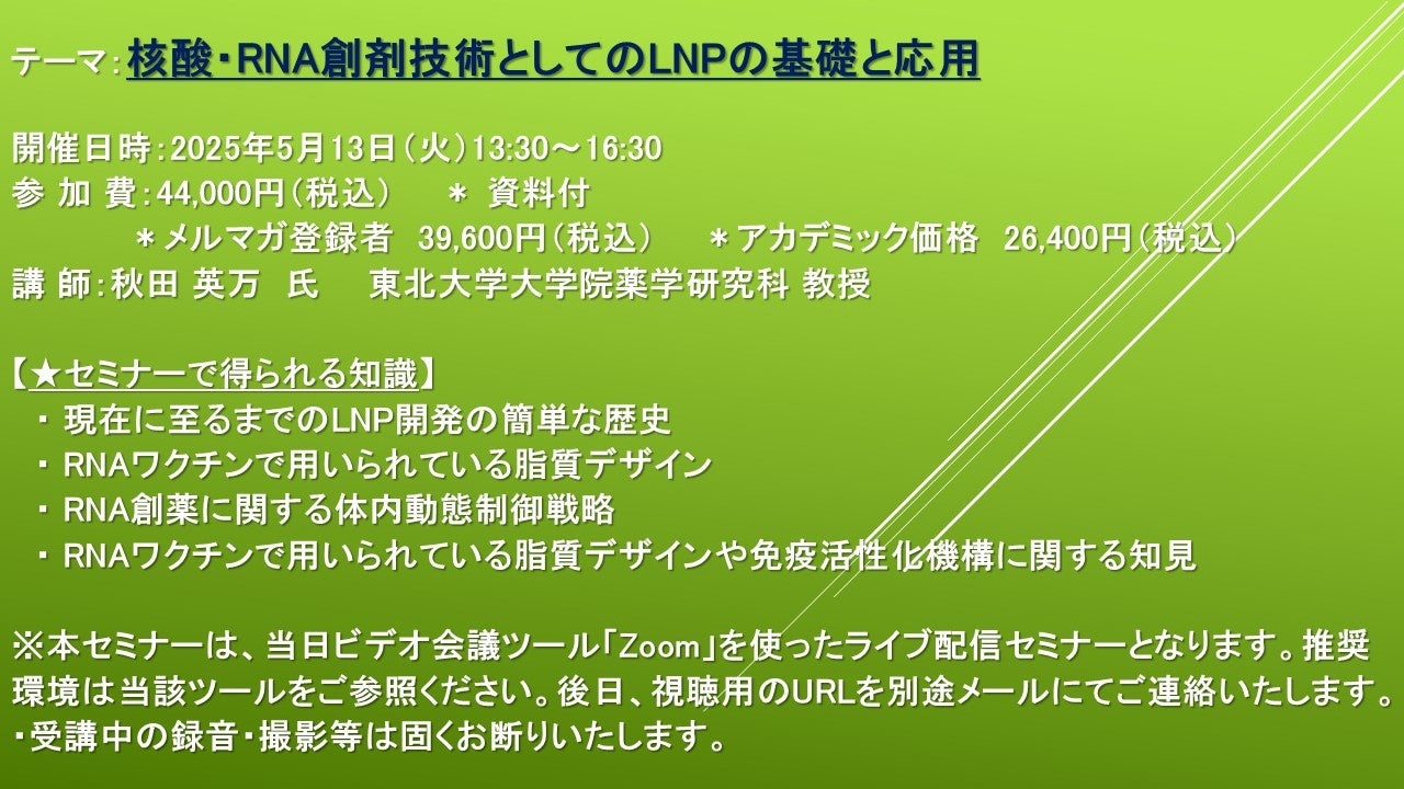 先端技術情報や市場情報を提供している(株)シーエムシー・リサーチ(千代田区神田錦町: https://cmcre.com/ )では、 各種材料・化学品などの市場動向・技術動向のセミナーや書籍発行を行っておりますが、 このたび「核酸・RNA創剤技術としてのLNPの基礎と応用」と題するセミナーを、 講師に秋田 英万 氏 (東北大学大学院薬学研究科 教授)をお迎えし、2025年5月13日(火)13:30より、 ZOOMを利用したライブ配信で開催いたします。 受講料は、 一般:44,000円(税込)、 弊社メルマガ会員:39,600円(税込)、 アカデミック価格は26,400円(税込)となっております(資料付)。