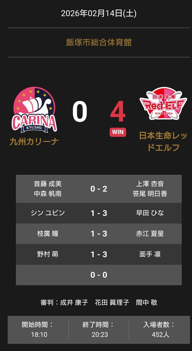 ノジマTリーグ 2025-2026 公式戦 2月14日開催 九州カリーナ vs 日本生命レッドエルフ 試合結果