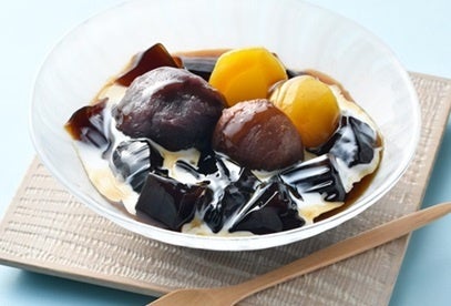 珈琲ジェリィに、むき栗と渋皮栗を添えてこし餡をトッピング。 黒蜜&コーヒーフレッシュをかけて召しあがれ。