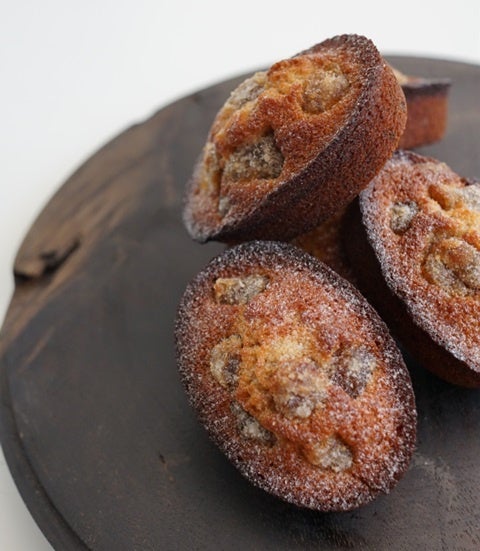アーモンドの女王といわれる「マルコナアーモンド」を 使用した、焦がしバター香る贅沢なフィナンシェ。栗とメープルシュガーを合わせて秋風味に。