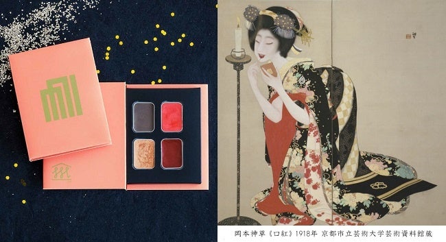 フェリシモが展開する「ミュージアム部」は、大正時代の日本画家・岡本神草(おかもと しんそう)の作品《口紅》から作った「日本画の妖艶な世界へ導くメイクパレット 岡本神草《口紅》」のウェブ販売を10月18日より行っています。作品にも描かれている舞妓が手に持つ当時の携帯用紅入れをモチーフにしたパッケージに、作品世界から抽出した、真紅のリップと、赤・ダークブラウン・ゴールドの3色のクリームアイシャドウが入ったセットです。肌色に合わせた「イエローベース」と「ブルーベース」の2タイプから選べます。妖しい魅力がただよう作品世界を、メイクをしながら感じ、さらに妖しく美しく変化する新しい自分が楽しめます。