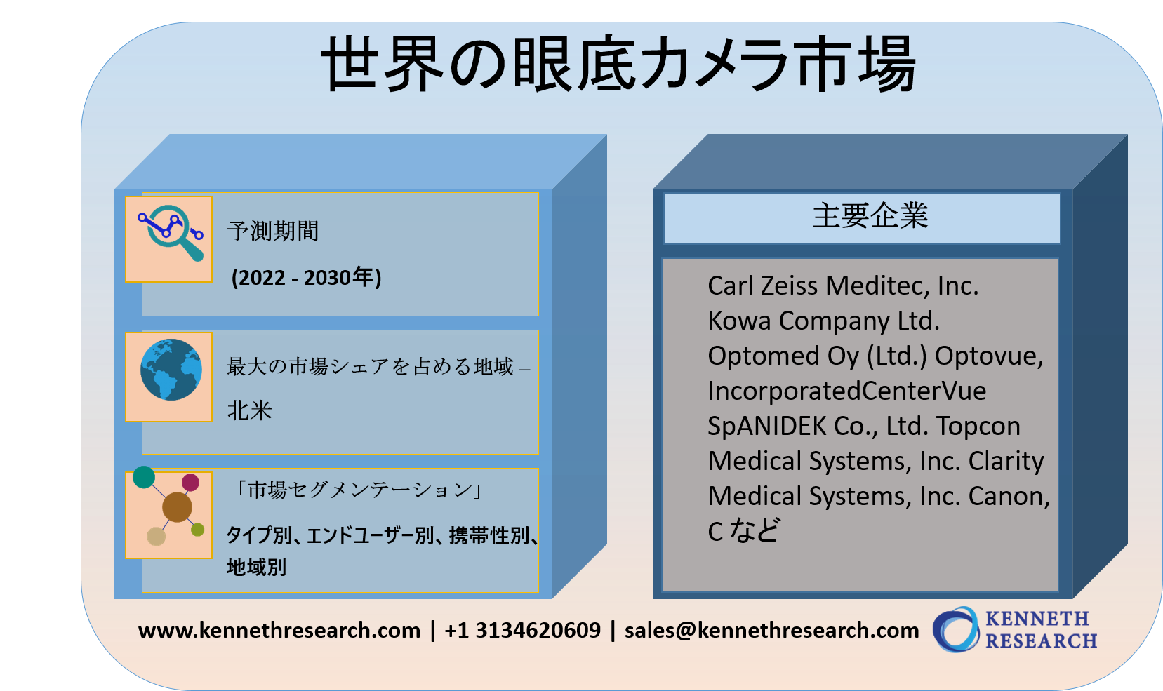 Kenneth Researchは調査レポート「世界の眼底カメラ市場:世界的な需要の分析及び機会展望2030年」を2022年01月 12日 に発刊しました。これは、詳細な市場の業界需要分析と市場の成長に影響を与えるさまざまな要因を提供します。レポートは、予測期間、市場価値、市場ボリューム、成長率、セグメント、市場プレーヤー、成長ドライバーを含む市場の成長を提供します。調査方法には、市場の評価と予測データの計算に基づく履歴データと現在のデータの収集が含まれます。このレポートのデータ収集には、一次調査と二次調査の両方が含まれます。