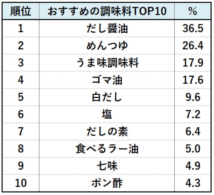 ※提示した選択肢:塩、ゴマ油、うま味調味料、だしの素、鶏ガラスープの素、めんつゆ、白だし、だし醤油、味付き塩、柚子胡椒、胡椒、黒コショウ、マヨネーズ、にんにくすりおろし、粉チーズ、ポン酢、七味、一味、オイスターソース、ラー油、食べるラー油、ワサビ、岩塩、ニョクマム・魚醤、酢、梅酢、ワインビネガー、バルサミコ、ごまだれ、白ゴマ、黒ゴマ、チリソース、シラチャーソース、コチュジャン、テンメンジャン、豆板醤、ナンプラー、タバスコ、中濃ソース、ウスターソース、ケチャップ、山椒、パルメザンチーズ、その他【自由回答】