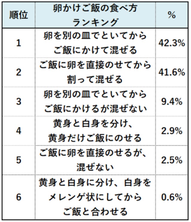 「卵かけご飯は好きですか?」という質問では、79.1%の人が好き(「とても好き」35.1%、「どちらかというと好き」44.1%の計)と回答。また、好き・苦手関係なく、卵かけご飯の食べ方について聞いたところ、1位「卵を別の皿でといてからご飯にかけて混ぜる」42.3%、2位「ご飯に卵を直接のせてから割って混ぜる」41.6%と1位・2位の食べ方だけで8割を超える結果に。最近SNSなどで話題の「白身をメレンゲ状にする」食べ方はわずか0.6%という結果になりました。