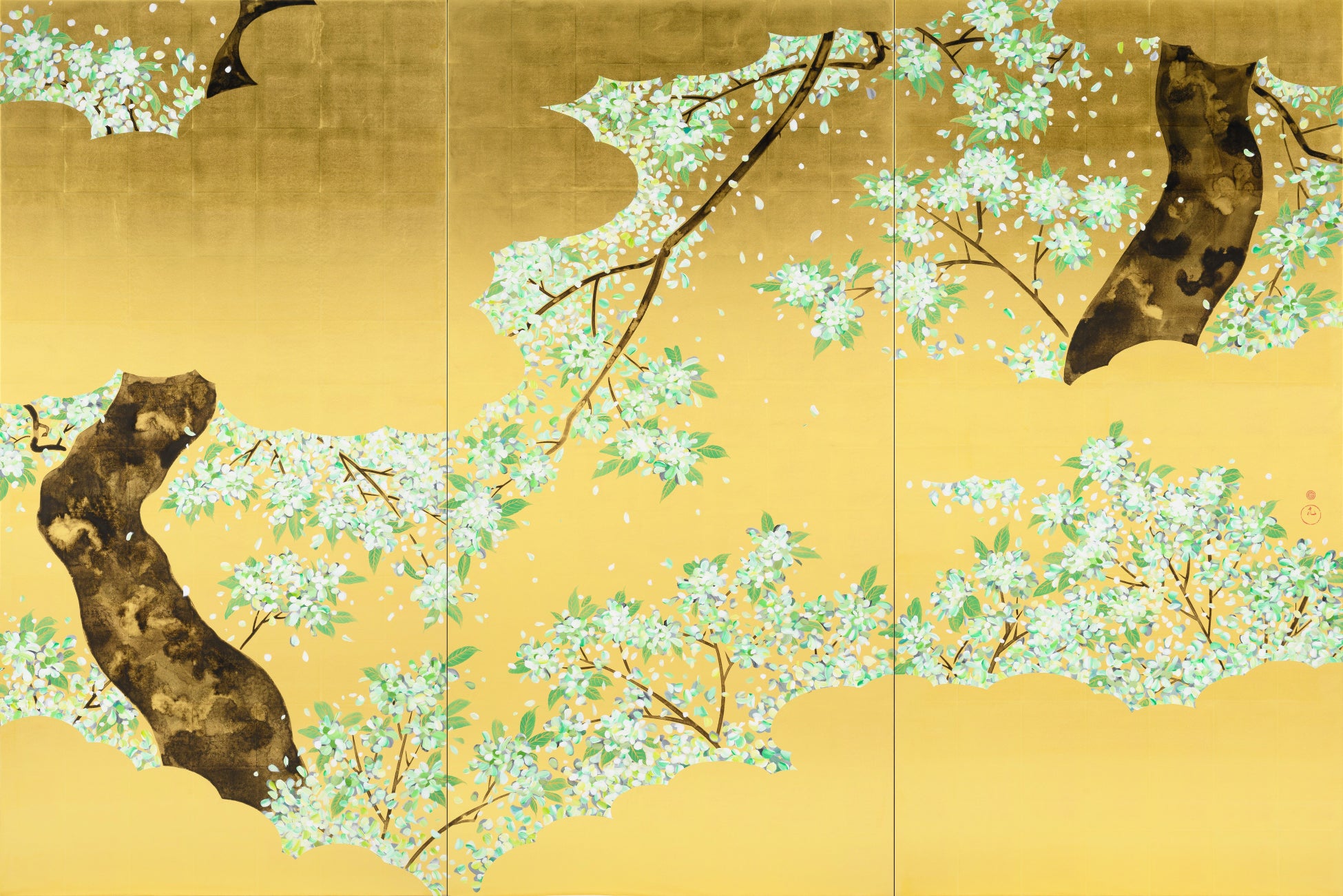本展の目玉となるのは、大島桜を描いた大作です。室町時代から続く金・緑・白・黒という伝統的な色使いで、金箔の背景に、白い花と緑の葉のコントラストが鮮烈な印象を放ちます。