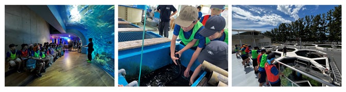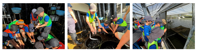 2日目は、静岡県浜松市の浜名湖体験学習施設ウォットからスタート。ここは、浜名湖の多様な生物を展示している水族館です。浜名湖は淡水と海水が混じりあう汽水湖です。およそ800種類の魚介類がいると言われています。飼育担当の工藤 隆馬さんによるバックヤードツアーに特別に案内してもらいました。予備槽では、ウナギやウニ、ヒトデなどを触らせてもらいました。