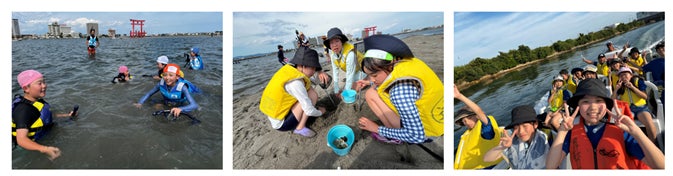 浜名漁協弁天島遊船組合の協力のもと船に乗って浜名湖の無人島・いかり瀬へ上陸。潮の満ち引きによって、水深が変わり、沢山の海の生き物や貝が生息しています。カニ、ハマグリ、クラゲなど長野県では見ることができない様々な生き物を見つけましたが、この日は水温が高く、魚は姿を表しませんでした。その後、調査隊は、船から浜名湖を見てみようと遊覧へ。カキの養殖場があるなど、浜名湖は人々の暮らしに欠かせない存在であることを学びました。