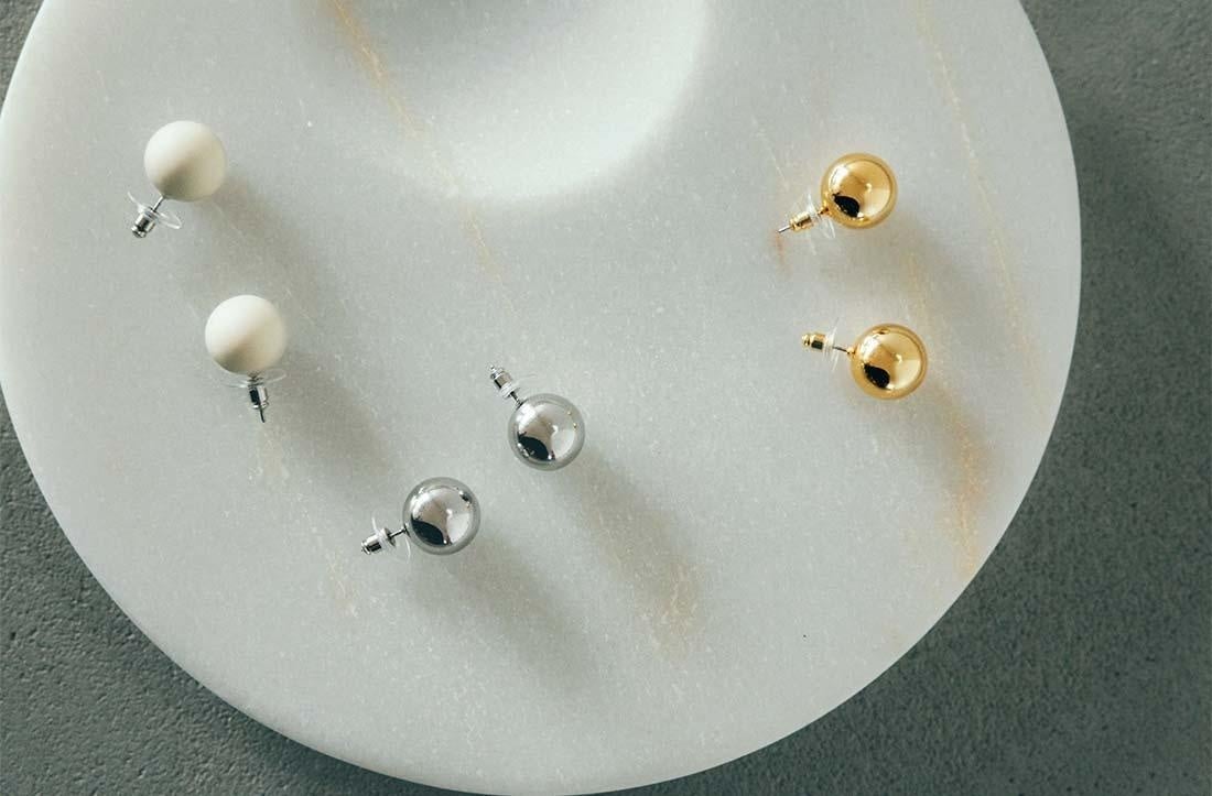 耳たぶにコロンと着けられるミドルサイズのイヤアクセです。かわいらしいまんまるフォルムが、ほかにない存在感を発揮します。コーデに凛(りん)としたアクセントを添える約15mm玉は、重い印象を与えずに気軽に着用できます。カラーはシルバーとゴールド、マットなホワイトの3種類です。