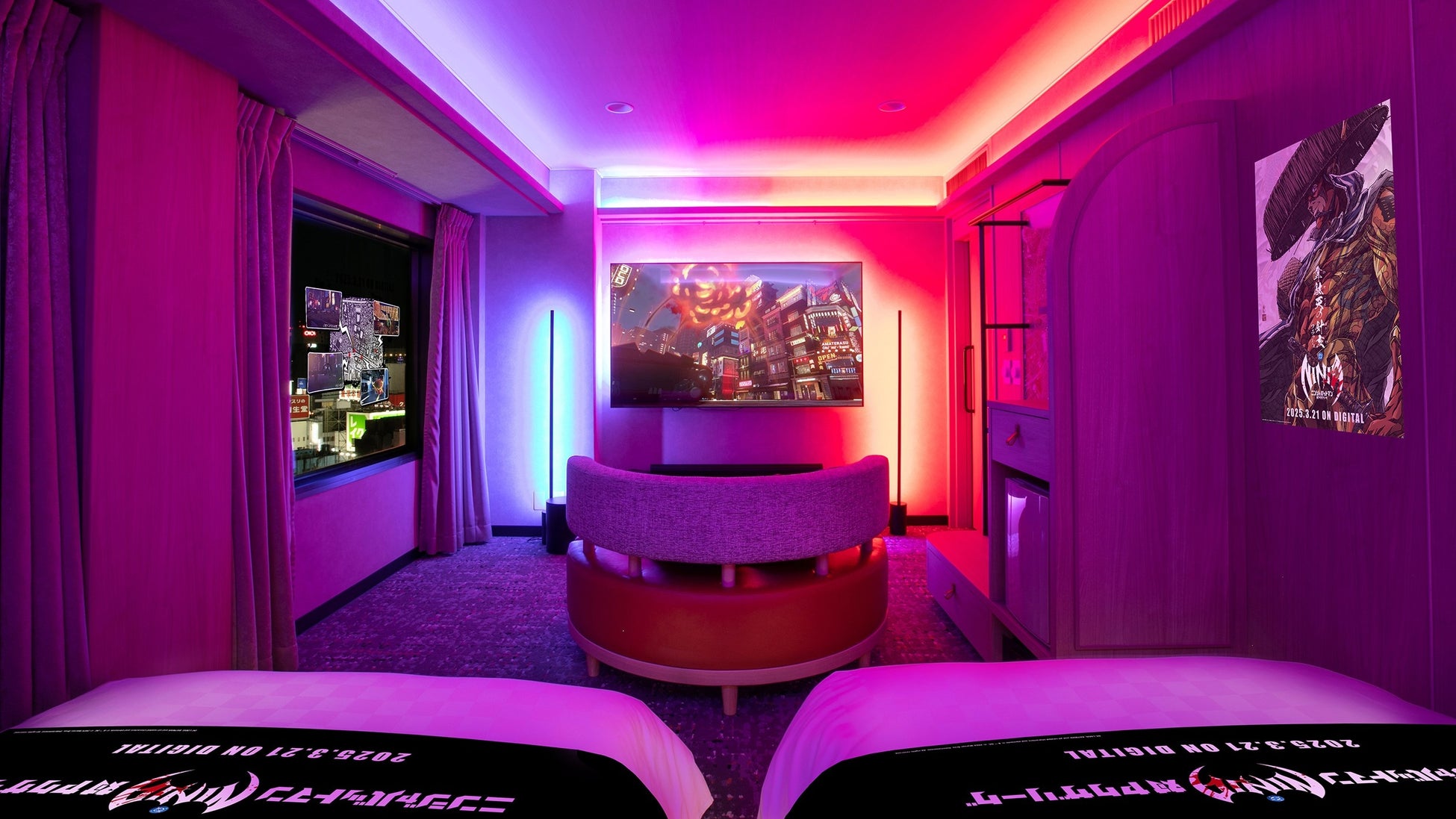 客室では1日1室限定コラボレーションルームを販売。作品に登場するキャラクターデザインを使用した装飾が施された客室で「ニンジャバットマン対ヤクザリーグ」の世界感をお楽しみいただけます。(*1) 75インチの大画面とサラウンドスピーカー、映像により色が変化する照明で作品の臨場感を演出いたします。さらにご宿泊者限定のオリジナルグッズもお持ち帰りいただけます。