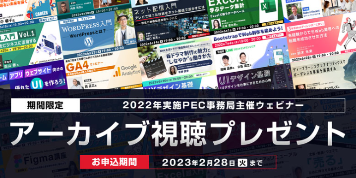 注目度の高いUI/UX関連のセミナーから、デジタルマーケティング関連、語学、Excelにいたるまで、実にさまざまな種類のセミナーをご視聴いただけます。なお、お申し込み期間は2月28日(火)まで。PECが提供するセミナーをアーカイブ視聴して、リスキリングしてみませんか?ご予定が合わず参加できなかった会員の方はもちろんのこと、新規でご登録いただいた方も対象となりますので、ご登録がお済みでない方はぜひこの機会にご登録ください。